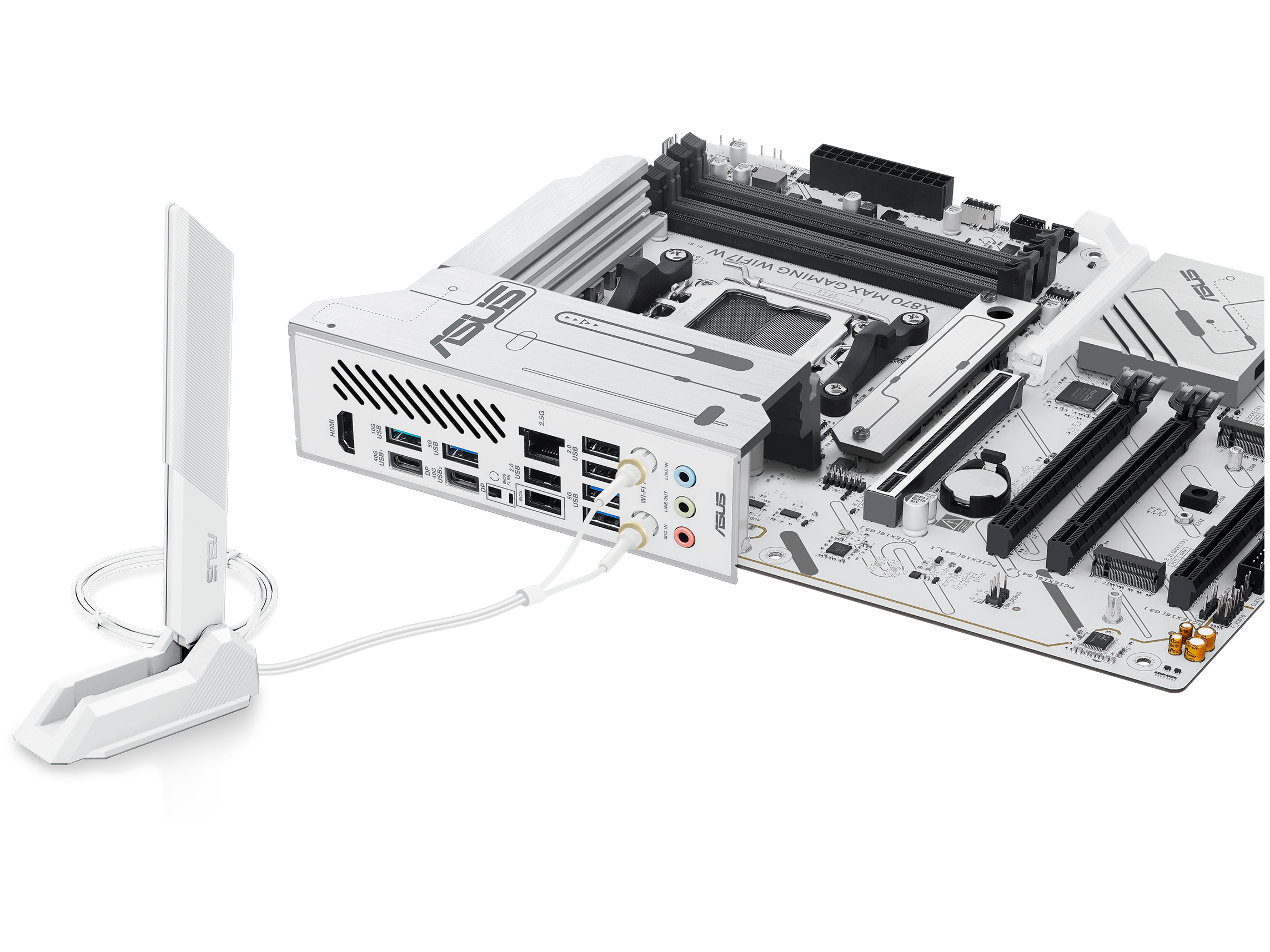 ASUS X870 MAX GAMING WIFI7 WHITE. Processorproducent: AMD, Processor sokkel: Sokkel AM5, Kompatibel processor serie: AMD Ryzen 7000 Series, AMD Ryzen 8000 Series, AMD Ryzen 9000 Series. Understøttede hukommelsestyper: DDR5-SDRAM, Maksimal intern hukommelse: 256 GB, Hukommelses slots type: DIMM. Understøttede lagerdrev brugerflader: M.2, SATA III, Understøttet datalagringsdrev typer: HDD & SSD, RAID-niveauer: 0, 1, 5, 10. USB-stik type: USB Type-A, USB Type-C. Ethernet-grænsefladetype: 2.5 Gigabit Ethernet, Bedste Wi-Fi standard: Wi-Fi 7 (802.11be)