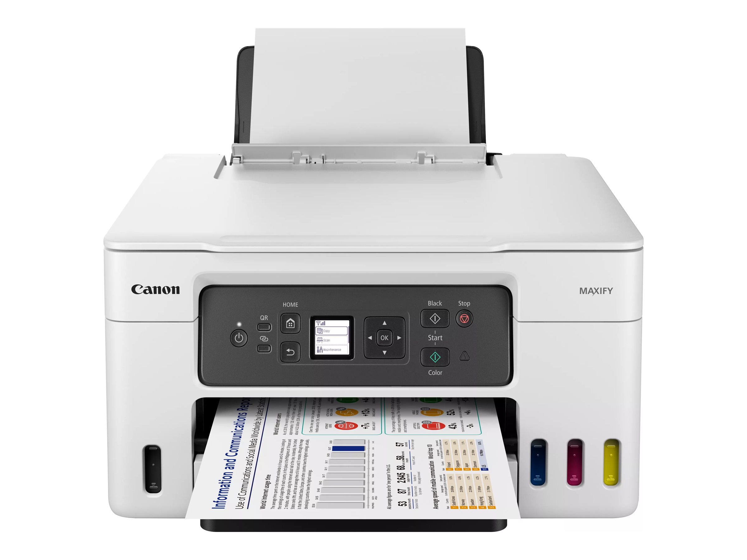 Print forretningsdokumenter i store volumener og høj kvalitet, samtidig med at du sparer penge på omkostningerne pr. side og de samlede ejeromkostninger med denne brugervenlige 3-i-1 MegaTank MAXIFY GX-printer med genopfyldelige blæktanke.
