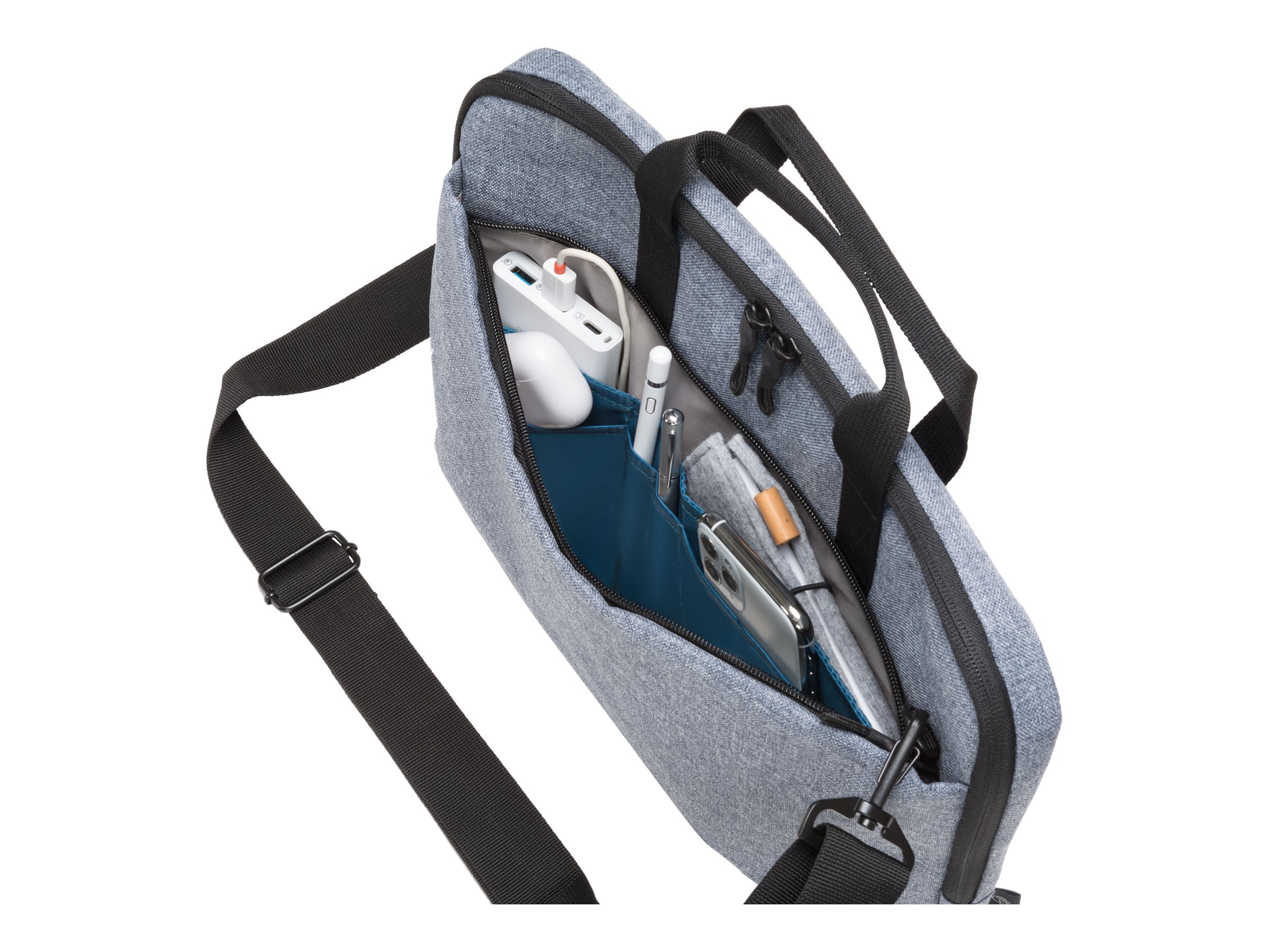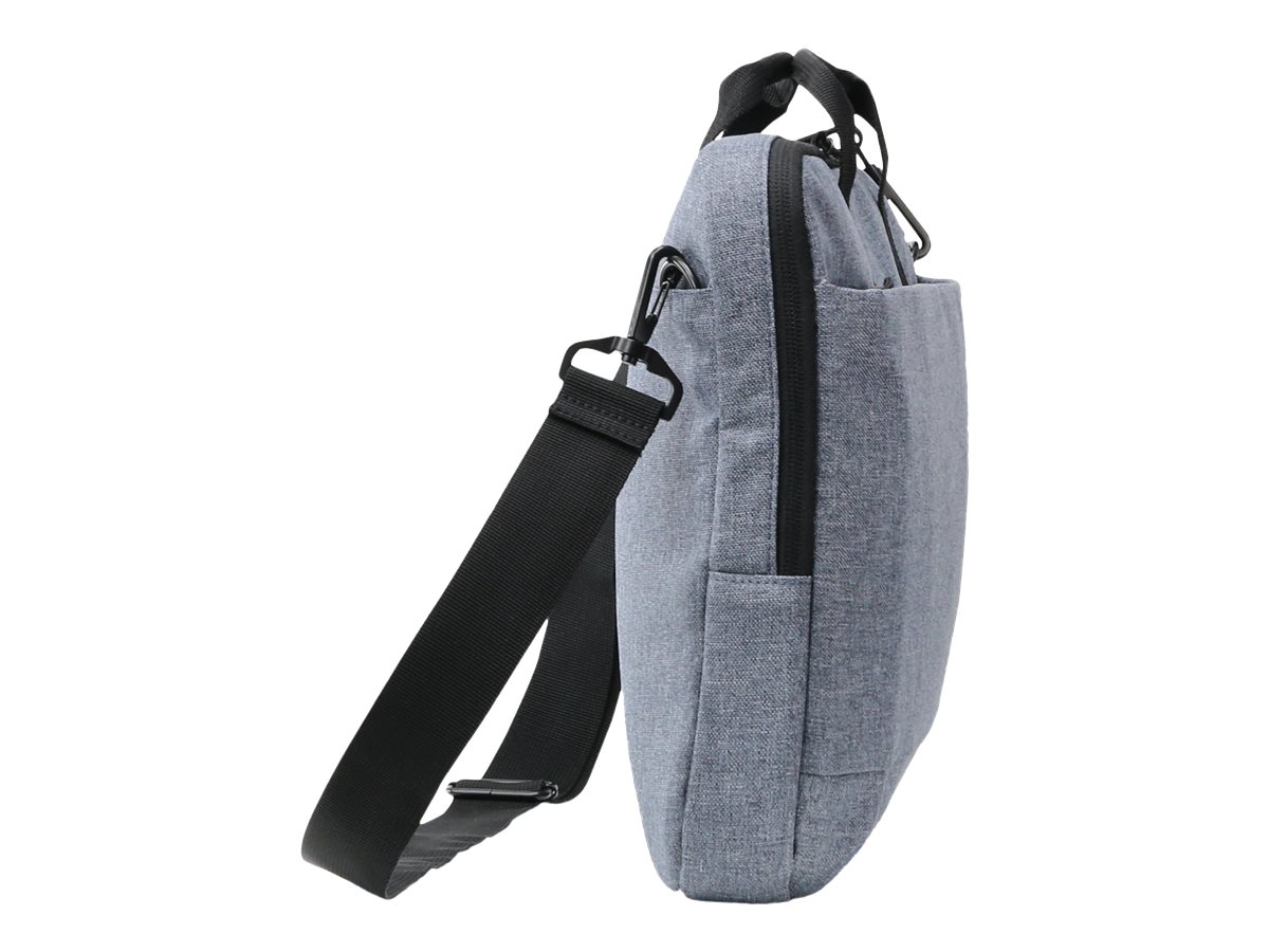 Eco slim case Motion er en let og slank taske til bærbare computere. Enheder mellem 10" og 11,6" er godt beskyttet i det polstrede notebook-rum. Stiklommen giver pålidelig beskyttelse til tablets op til 10,9". Tasken er behagelig at bære takket være det polstrede bærehåndtag og den justerbare skulderrem. Det ekstra rum på bagsiden er især praktisk til nem opbevaring af dokumenter. Din smartphone eller andre mindre ting som kabler, kuglepenne eller opladere kan opbevares i den praktiske forlomme, så de altid er lige ved hånden. Tasken er lavet af vandafvisende materiale for at beskytte indholdet selv på regnfulde dage. Eco slim case Motion er derfor perfekt til dig, der altid er på farten og gerne vil støtte genanvendelsen af PET-flasker med en miljøvenlig taske.