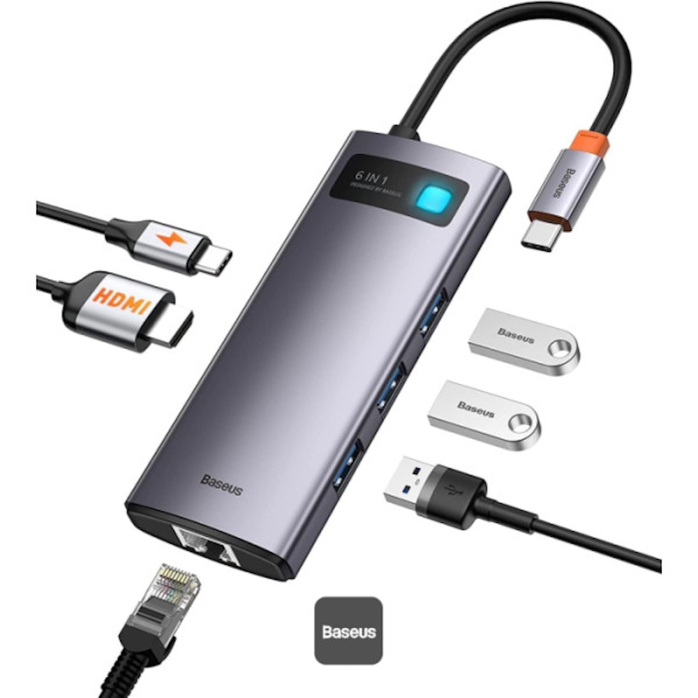 Baseus Metal Gleam Series 6-in-1 hub - HDMI: 4K@30Hz - USB PD 100W - Gigabit ethernet - 5Gbps