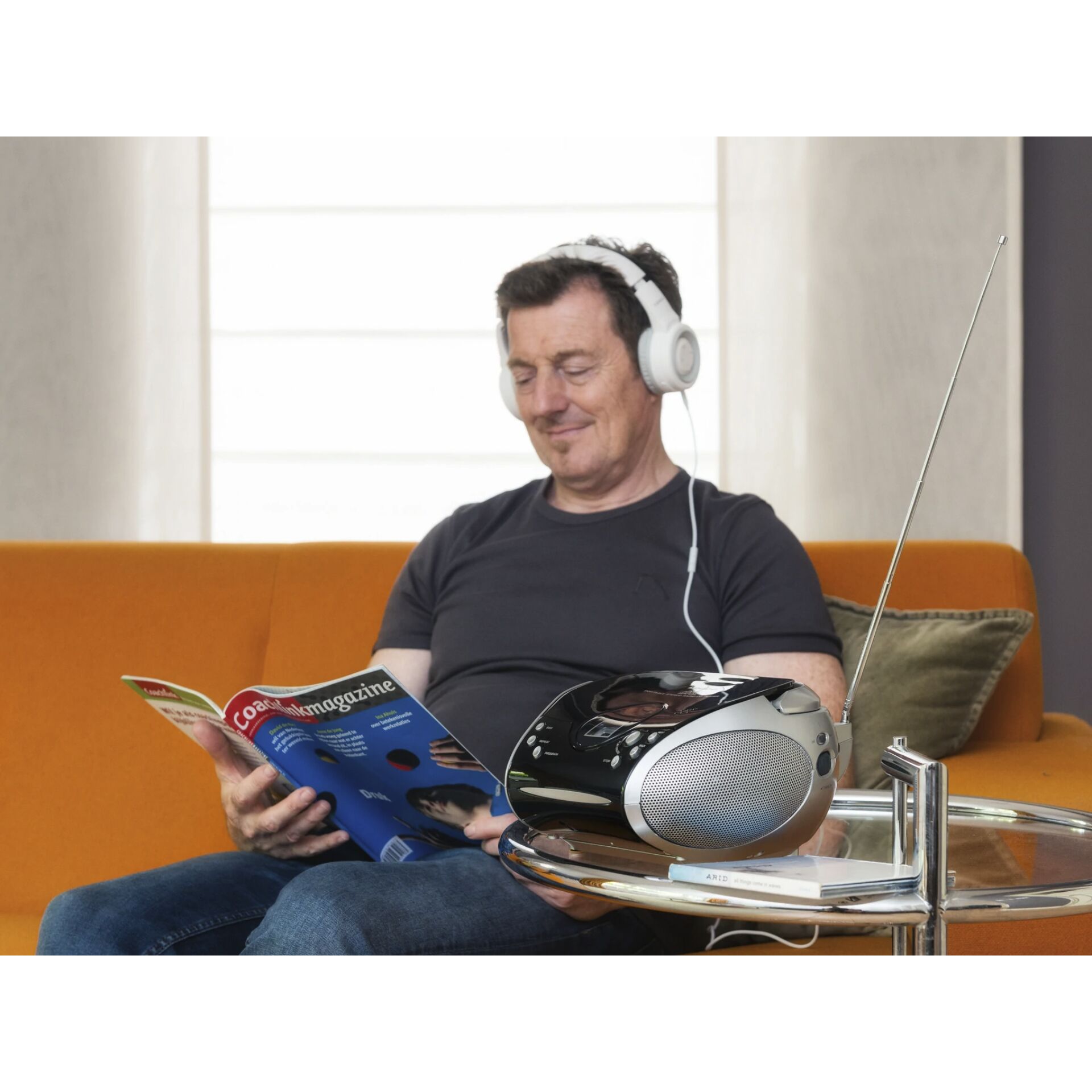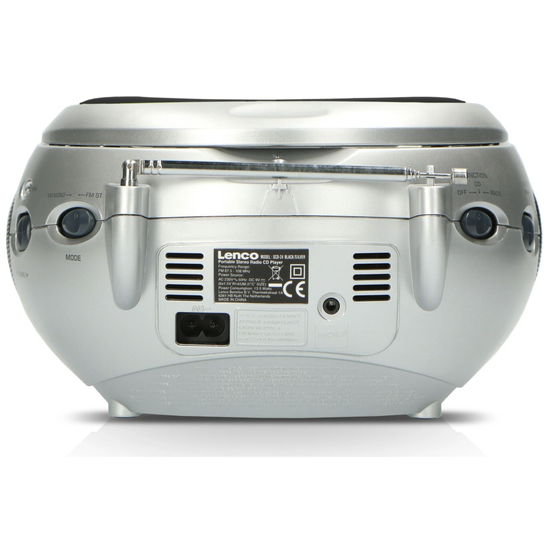 Lenco SCD-24. Tuner type: Digital, Understøttede radiobånd: FM, FM båndbredde: 87,5 - 108 MHz. Optisk drevtype: Afspiller, Understøttede disktyper: CD, Afspilningstilstande: Tilfældig, Gentag, Gentag alle. Skærmtype: LCD. Produktfarve: Sort, Sølv, Kontroltype: Knapper, Volumenkontrol: Berøring. Tilslutning af hovedtelefoner: 3,5 mm