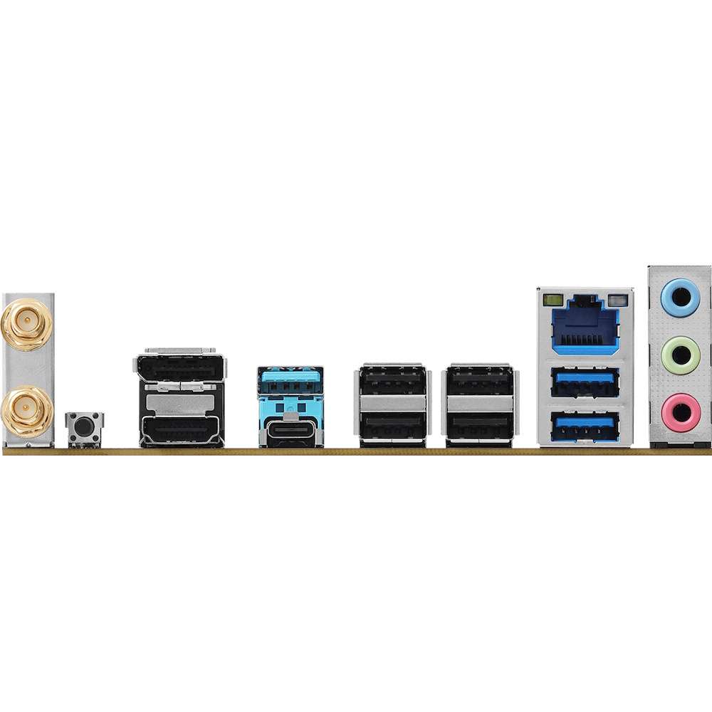 | Rear Panel I/O | 2x Antenna Ports, 1x HDMI Port, 1x DisplayPort 1.4, 1x USB 3.2 Gen2 Type-C Port (10 Gb/s), 1x USB 3.2 Gen2 Type-C Port, 2x USB 3.2 Gen1 Ports, 4x USB 2.0 Ports, 1x RJ-45 LAN Port, 1x BIOS Flashback Button, HD Audio Jacks: Line in / Front Speaker / Microphone |