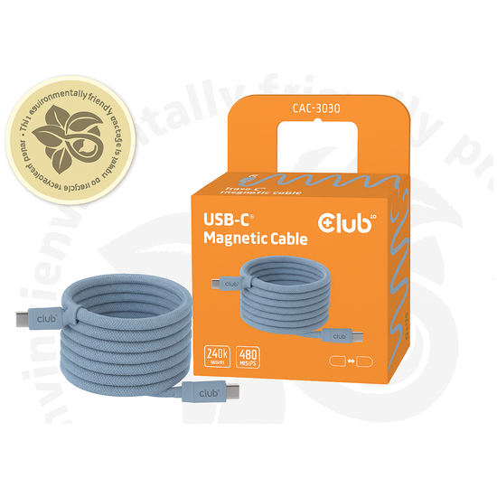 Club 3D - USB-kabel - USB-C (han) til USB-C (han) - USB 2.0 - 48 V - 5 A - 2 m - snoet, USB Power Delivery (240 W), Power Delivery 3.1 support, magnetisk - blå