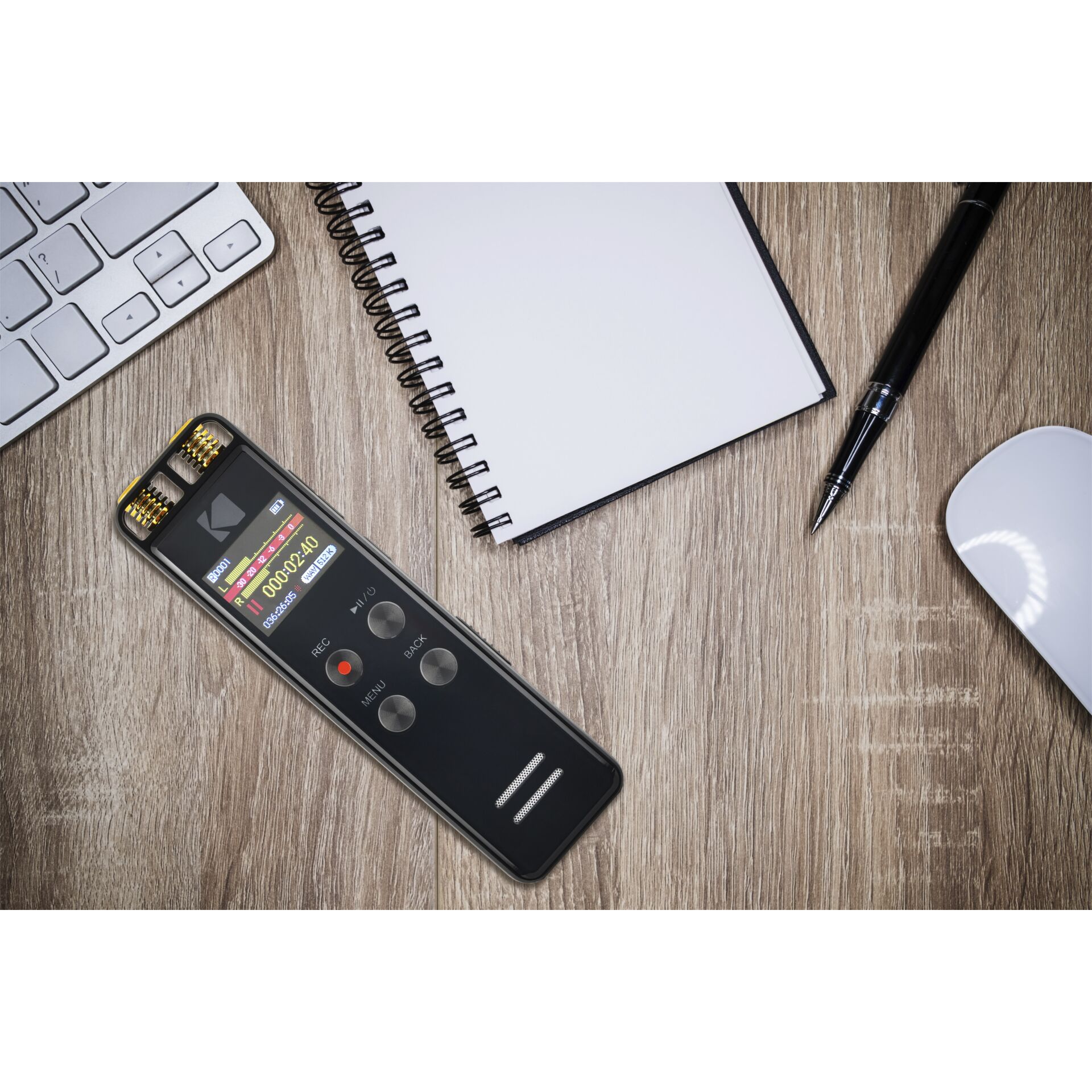 Kodak VRC550. Maksimal optagetid: 725 t, Optagelsestilstande: Høj kvalitet (HQ), Lang afspilning (LP), Standard afspilning (SP), Understøttede lydformater: AAC-LC, APE, FLAC, M4A, MP3, OGG, WAV, WMA. Skærm diagonal: 3,56 cm (1.4"). Grænseflade: 3.5mm, USB-stik type: USB Type-C. Batteriteknologi: Lithium-Ion (Li-Ion), Batterikapacitet: 260 mAh, Batterispænding: 3,7 V. Understøttede medietyper: Intern hukommelse & flash kort, Kompatible hukommelseskort: MicroSD (TransFlash), Indbygget hukommelseskapacitet: 16 GB