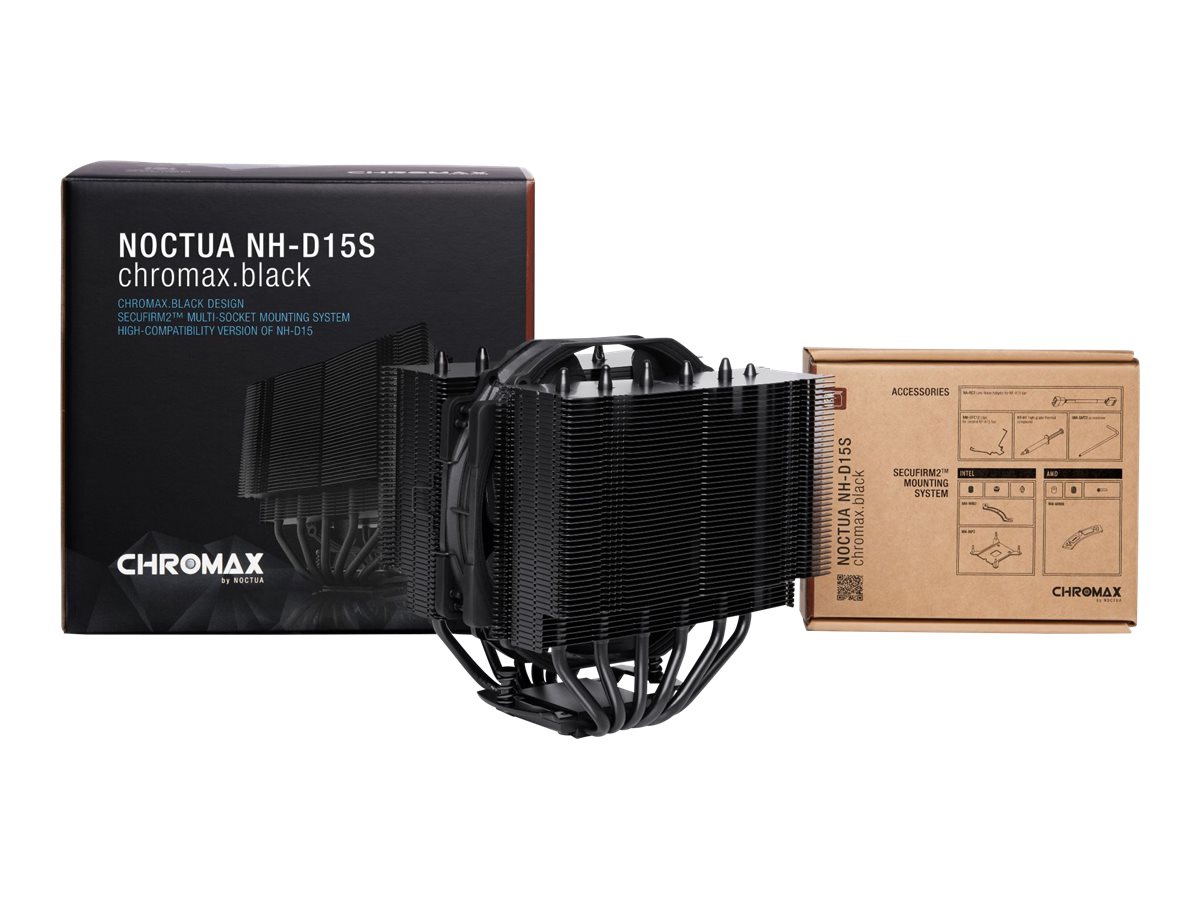 NH-D15S chromax black er en helt sort version af Noctuas støjsvage CPU-køler NH-D15S af høj kvalitet. Takket være det samme asymmetriske dual-tower heatsink-design og den enkelte NF-A15 PWM-blæser forbliver den tro mod NH-D15S' succesfulde formel med at fusionere dual-tower performance med fremragende RAM-, kabinet- og PCIe-kompatibilitet. Samtidig kombinerer den chromax-sorte version med sin sorte blæser og sortbelagte heatsink disse aktiver med et slankt stealth-look. Med SecuFirm2 multisocket-monteringssystemet og Noctuas NT-H1 termiske blanding i entusiastklasse er NH-D15S chromax black et førsteklasses valg for kunder, der søger en yderst kompatibel dual-tower heatsink, der ser lige så godt ud, som den køler.
