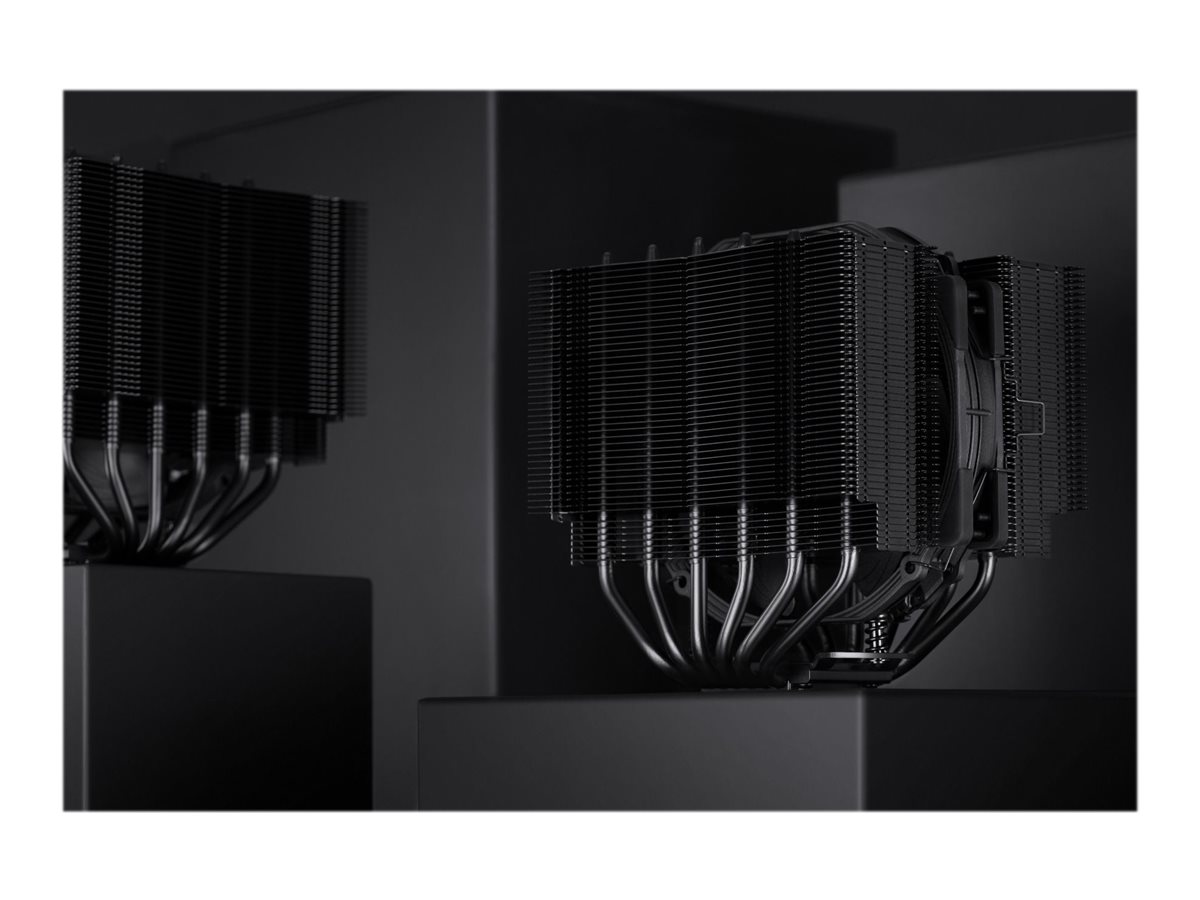 NH-D15S chromax black er sort fra top til tå: Med en sortbelagt heatsink, sorte blæsere med sorte antivibrationspuder, sorte blæserclips og sorte monteringsdele passer den perfekt ind i helt sorte builds og er nem at integrere med andre farveskemaer.