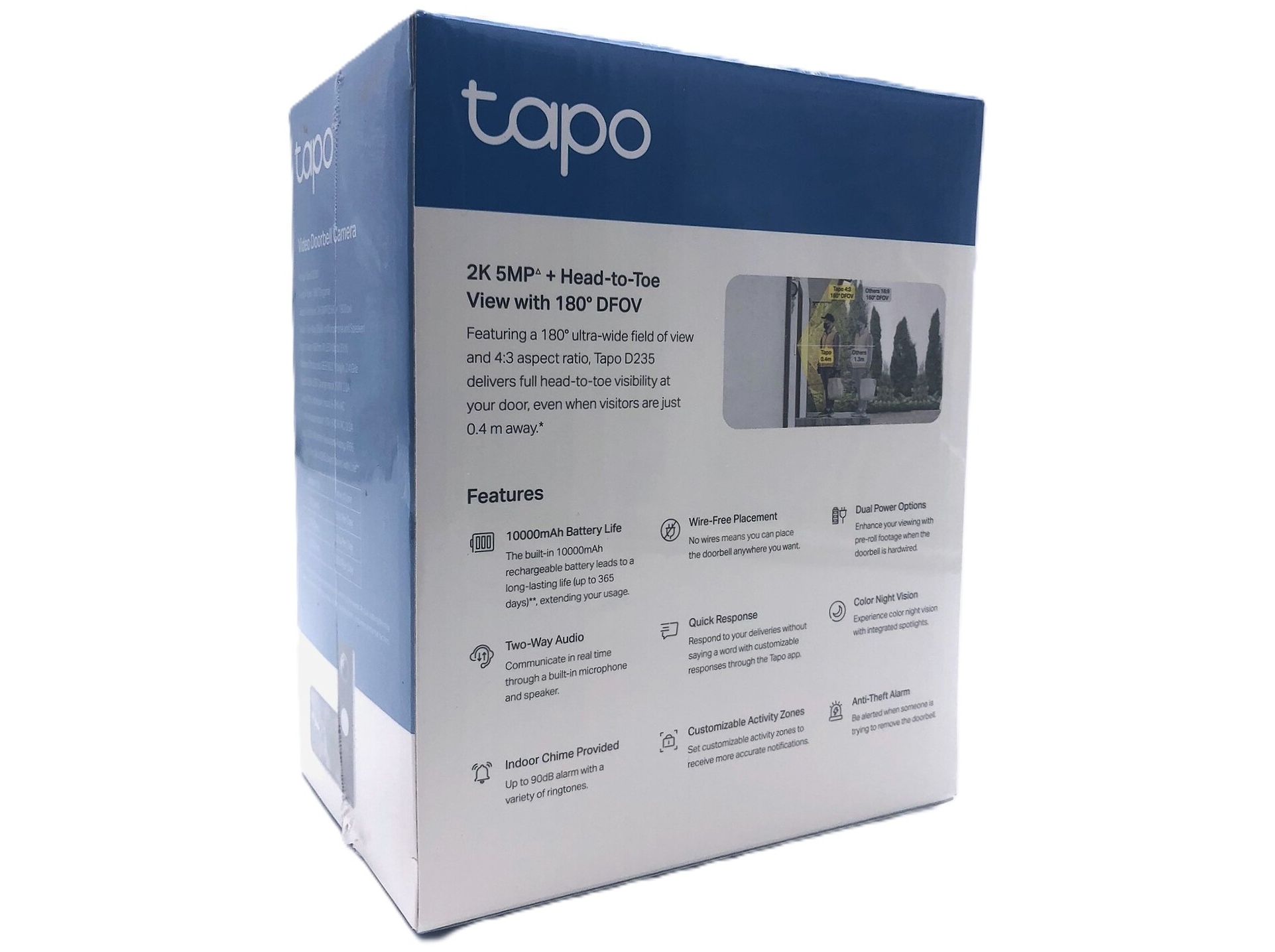 Tapo D235 V1 er udstyret med AI Person and Pet Detection og sikrer, at du kun bliver advaret om de bevægelser, der betyder noget. Kombineret med et 180° synsfelt og en opløsning på 5 megapixel leverer den omfattende dækning og krystalklare billeder af dit dørtrin.