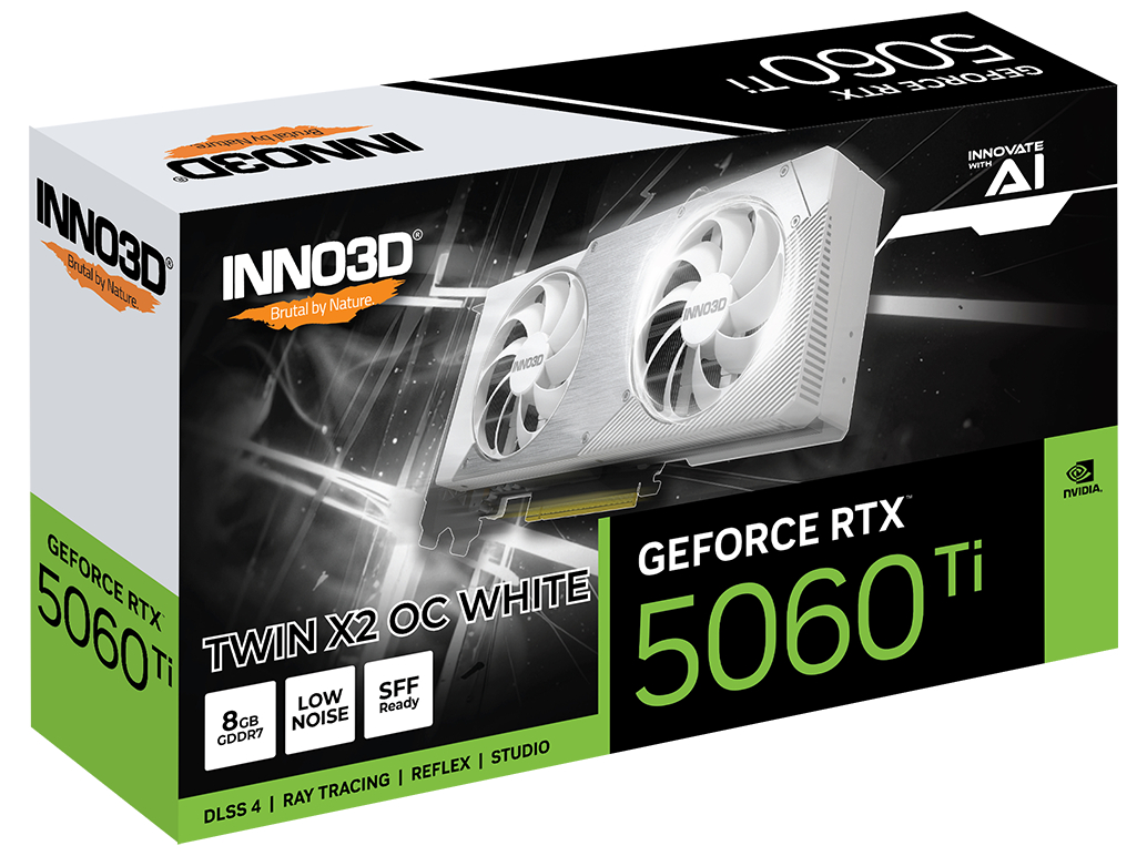 Produktbeskrivelse Inno3D GeForce RTX 5060 Ti 8GB TWIN X2 OC - grafikkort - GeForce RTX 5060 Ti - 8 GB - hvid