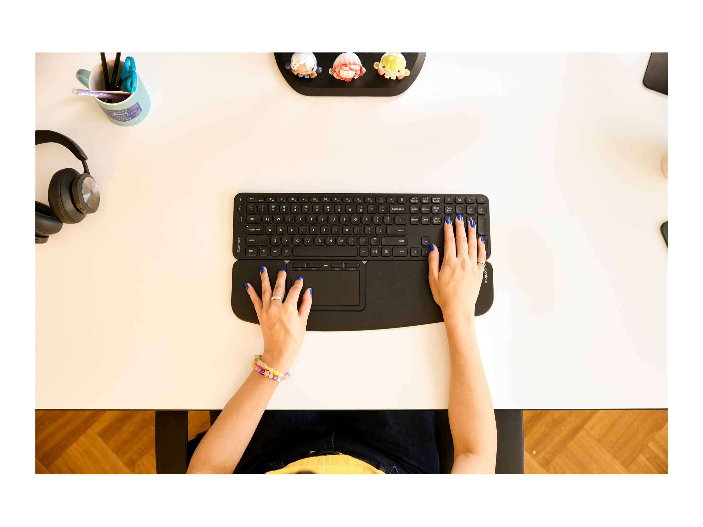 Balance Full-Size Keyboard er ikke kun ergonomisk - det er den perfekte partner til RollerMouse Pro3 og Contour Touch. Kombiner med RollerMouse Pro3 eller Contour Touch for en fuldt funktionel opsætning, der aflaster dine skuldre. Den matchende bredde og lave profil holder dig i en naturlig, afslappet og central position. Resultatet er en mere jævn arbejdsgang, færre skuldersmerter og øget komfort.