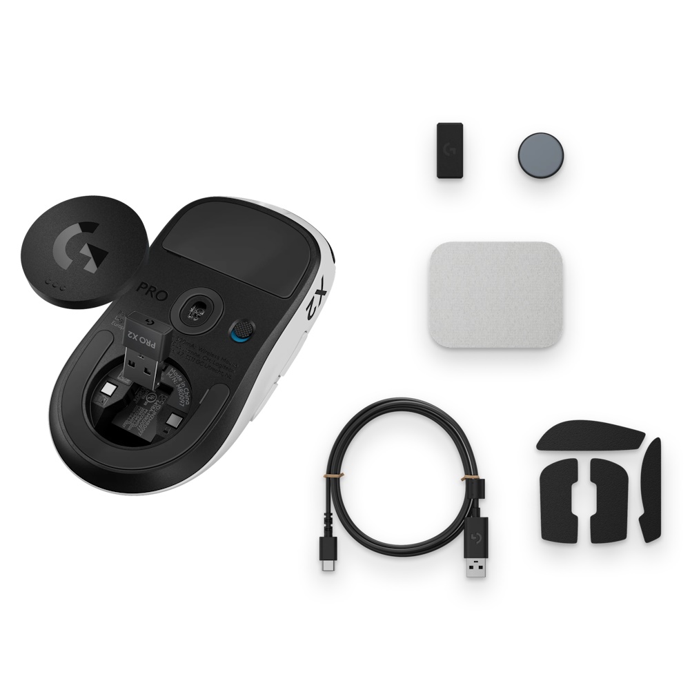 Inkluderet PRO X2 SUPERSTRIKE trådløs gaming-mus, Trådløs LIGHTSPEED-modtager, USB A til C-opladnings-/datakabel, Forlængerledning med adapter til modtageren, POWERPLAY-dør med PTFE-fod, Valgfrit klæbebånd for bedre greb, Rengøringsklud, Brugervejledning