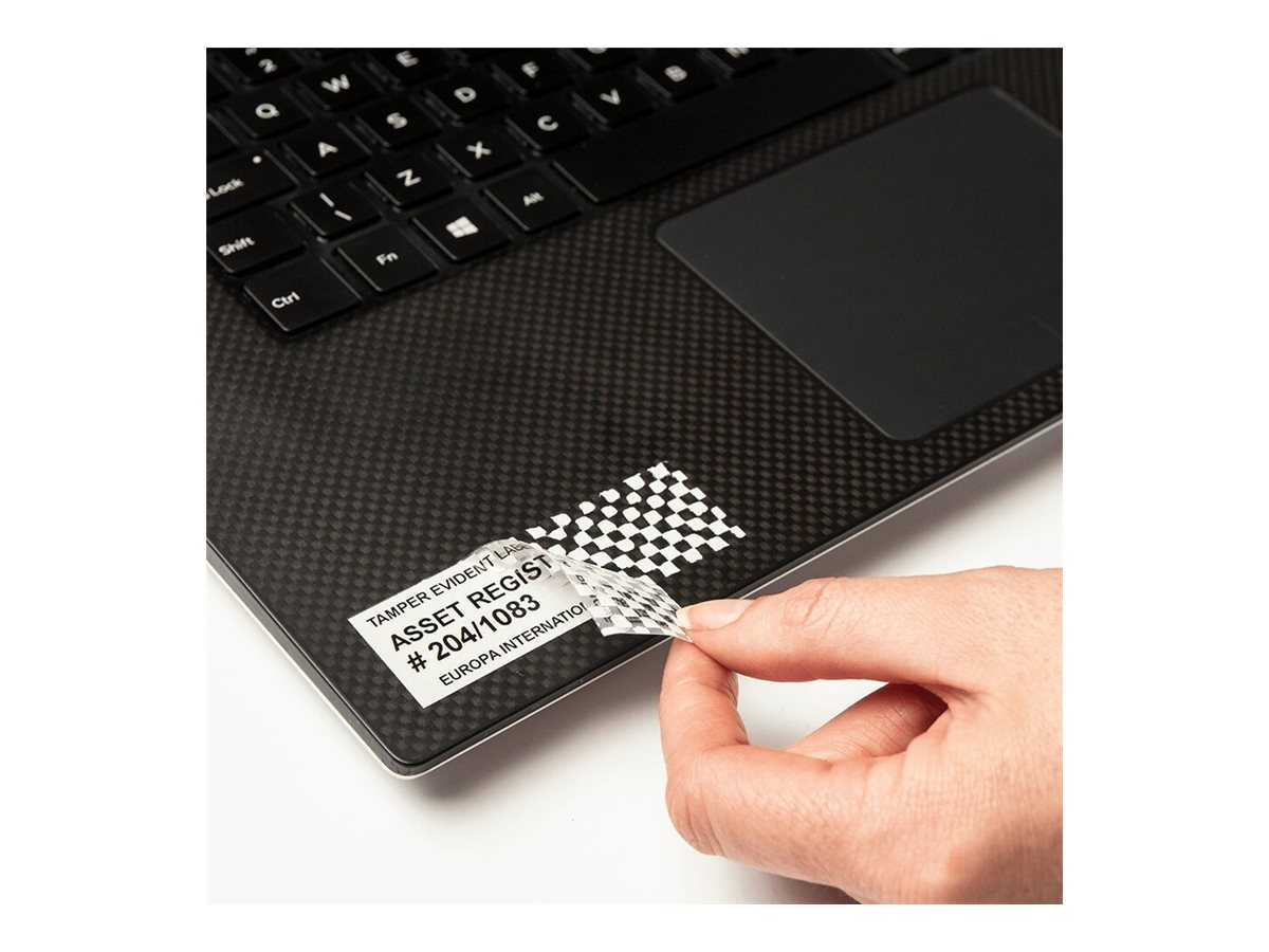 Brothers originale TZe-SE5 sort på hvid sikkerhedstape. Når TZe-SE5 sikkerhedstape fjernes, efterlader labelen et skakternet mønster på genstanden og på tapen. Det gør det nemt at opdage, om en label er blevet fjernet fra en genstand, og forhindrer, at labelen anvendes andetsteds.