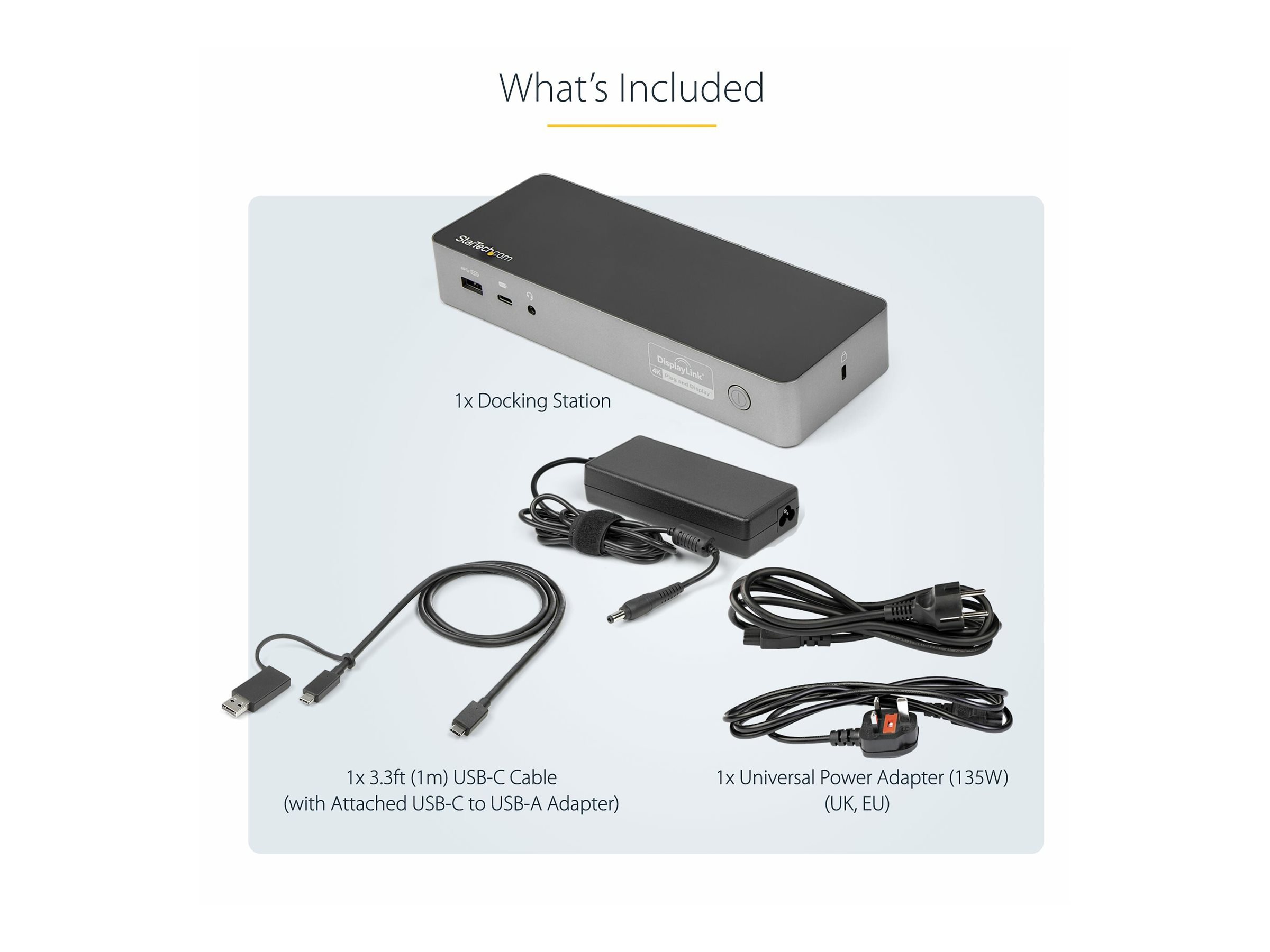| Egenskaber | Slot sikkerhedslås (kabel lås sælges separat), arm til to monitorer, Preboot Execution Environment (PXE) support, fuld duplex-support, DisplayPort Alt Mode, 60 W strømlevering |