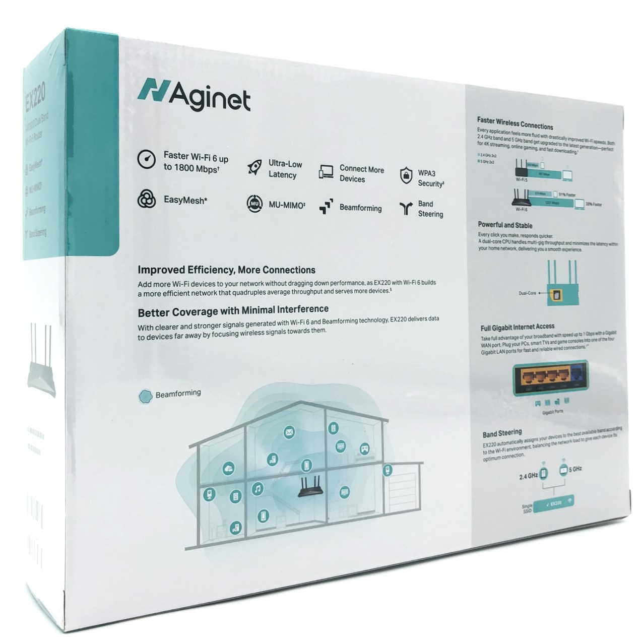 | Egenskaber | Forældrekontrol, Tilgangspunkt, drift, WMM support, virtuel server support, Multiple SSID support, nulstillingsknap, port triggering, SPIF, DoS, MU-MIMO teknologi, stråleformeteknologi, dobbeltbånd, routertilstand, Airtime Fairness, TR-069 Remote Management, DMZ-support, sort liste, hvidliste, DynDNS, trådløs adgangskontrol, OFDMA, OpenVPN server, WPS-knap, EasyMesh, Guest Network, Address Reservation |