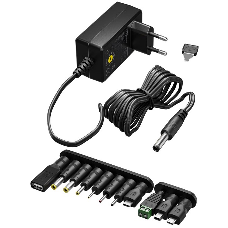 Adapters DC adapters: 5.5 x 2.5 mm, 2.5 x 0.7 mm, 3.0 x 1.1 mm, 3.5 x 1.35 mm, 4.0 x 1.7 mm, 4.8 x 1.7 mm, Micro-USB, Mini-USB, USB-C, USB-A socket, Screw terminal