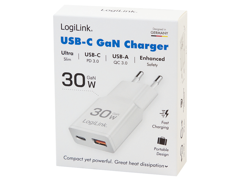 LogiLink - Strømforsyningsadapter - GaN - 30 Watt - USB-C, USB-A - hvid