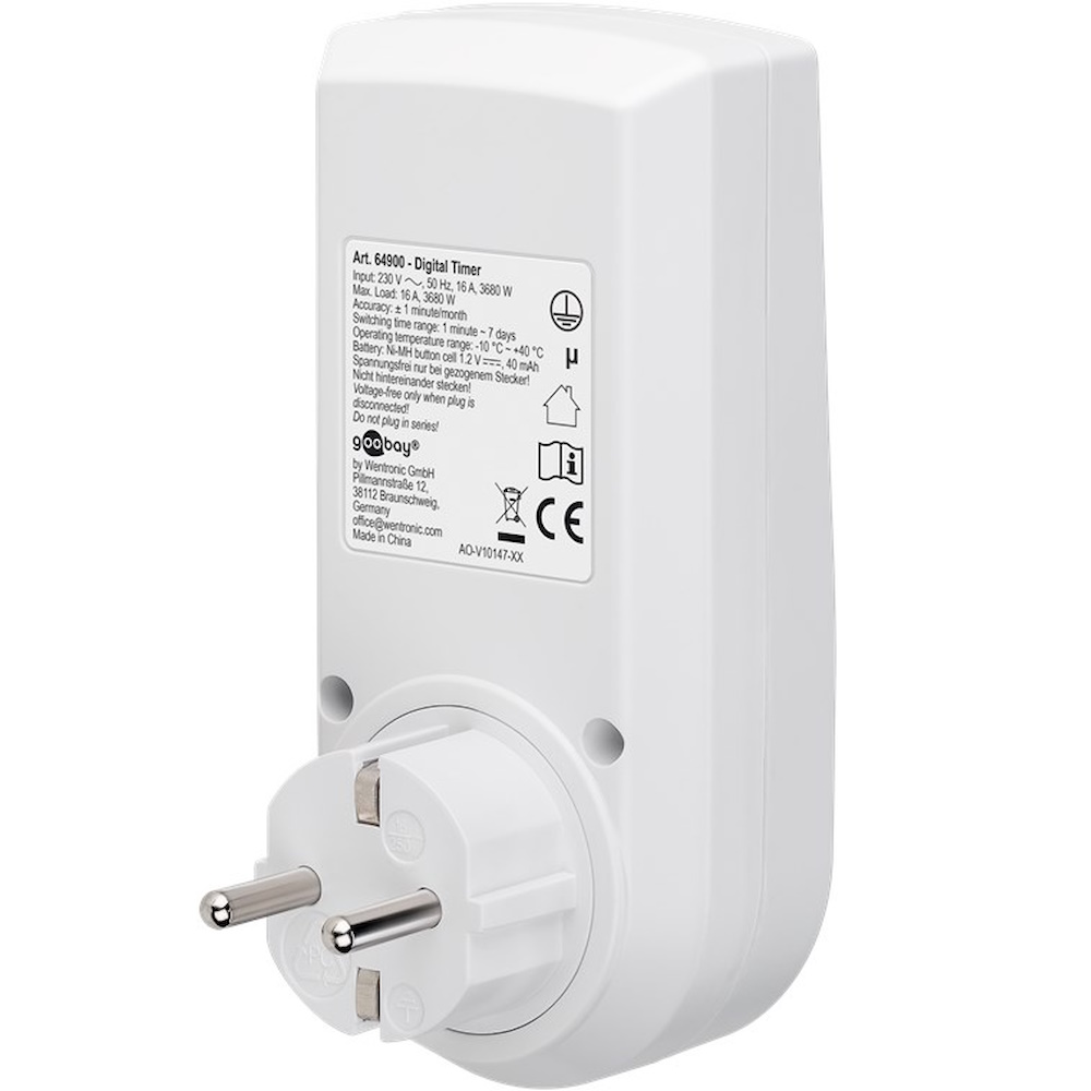 | Funktioner | Random mode (simulates presence in the home), Saves up to 10 settings, 16 predefined weekday combinations |