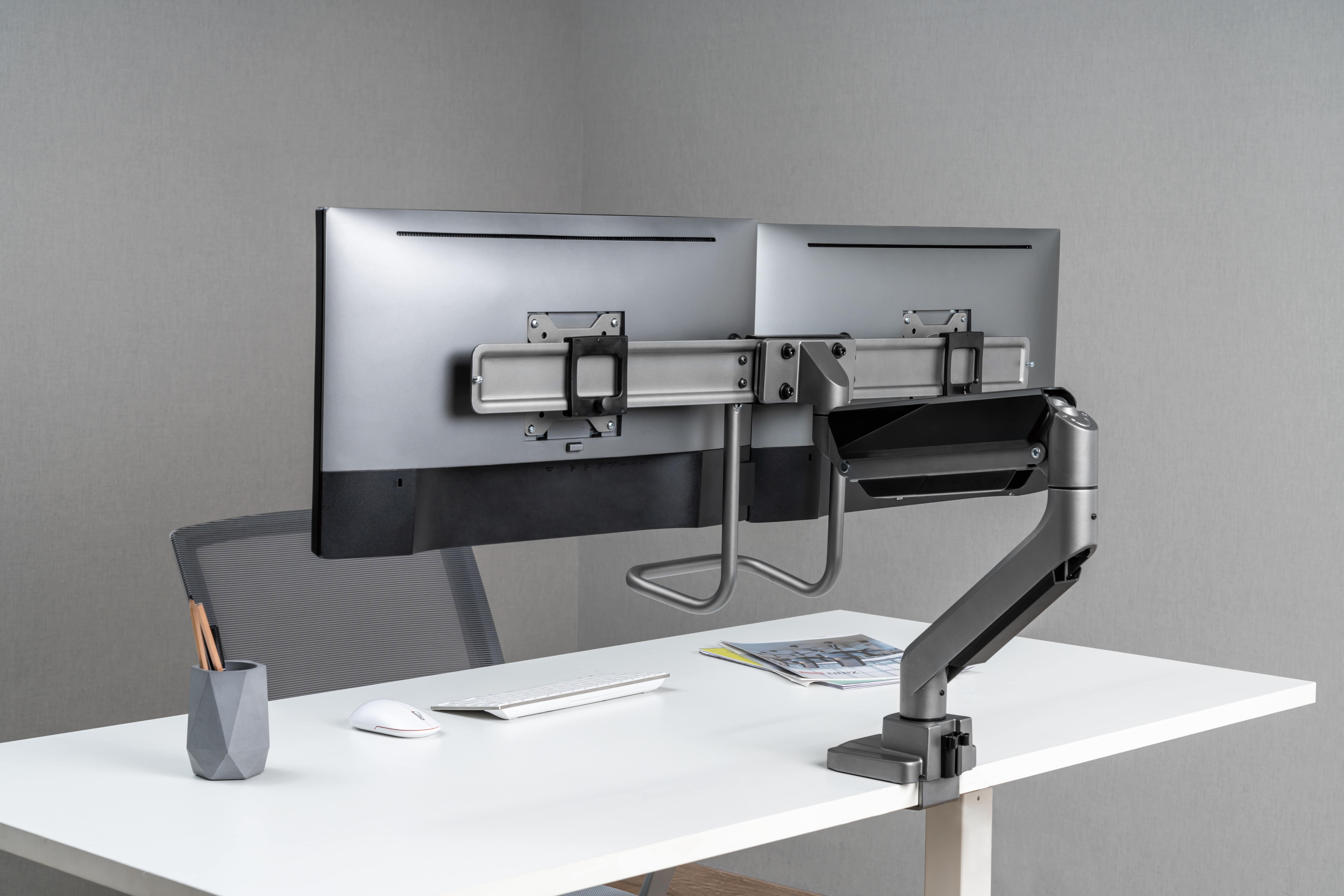 Designed for most 17"-32'' monitors and holds up to 8kg/17.6lbs (per screen), the Nordic Office SH 3002-SG Heavy-Duty Gas Spring Monitor Arm is perfect for heavy and oversized displays. Sliding horizontal monitor bar for easy seamless monitor placement. Interactive handle positions monitors from a single handle location. Integrated 180° rotation stop prevents the arm from hitting adjacent partitions and walls. Quick-release VESA plate for quick mounting or removal of the monitor in mere seconds. Rear tool holder provides easy access for any future adjustment. With absolutely great prices, the Nordic Office SH 3002-SG is one of the best choices to bolster your sales!