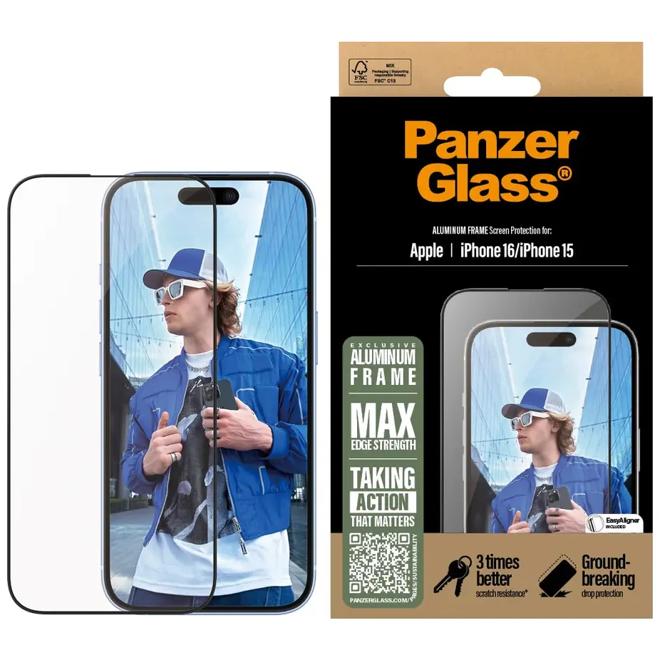 PanzerGlass - Skærmbeskytter for mobiltelefon - ultrabred pasform med EasyAligner - glas - aluminiumsramme - for Apple iPhone 16, 15