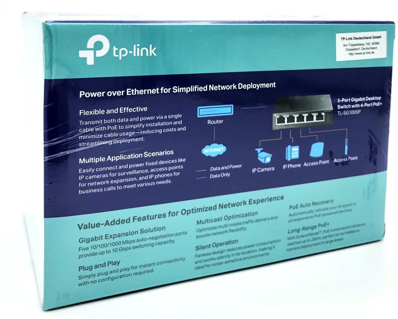 | Features | Flow control, full duplex capability, power over Ethernet (PoE), auto-negotiation, auto-uplink (auto MDI/MDI-X), store and forward, fanless |