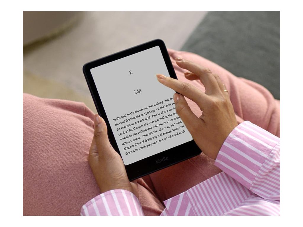Kindle Paperwhite er lettere og tyndere end en paperback, så du kan holde den komfortabelt i begge hænder i lange læsesessioner uden træthed eller ubehag.