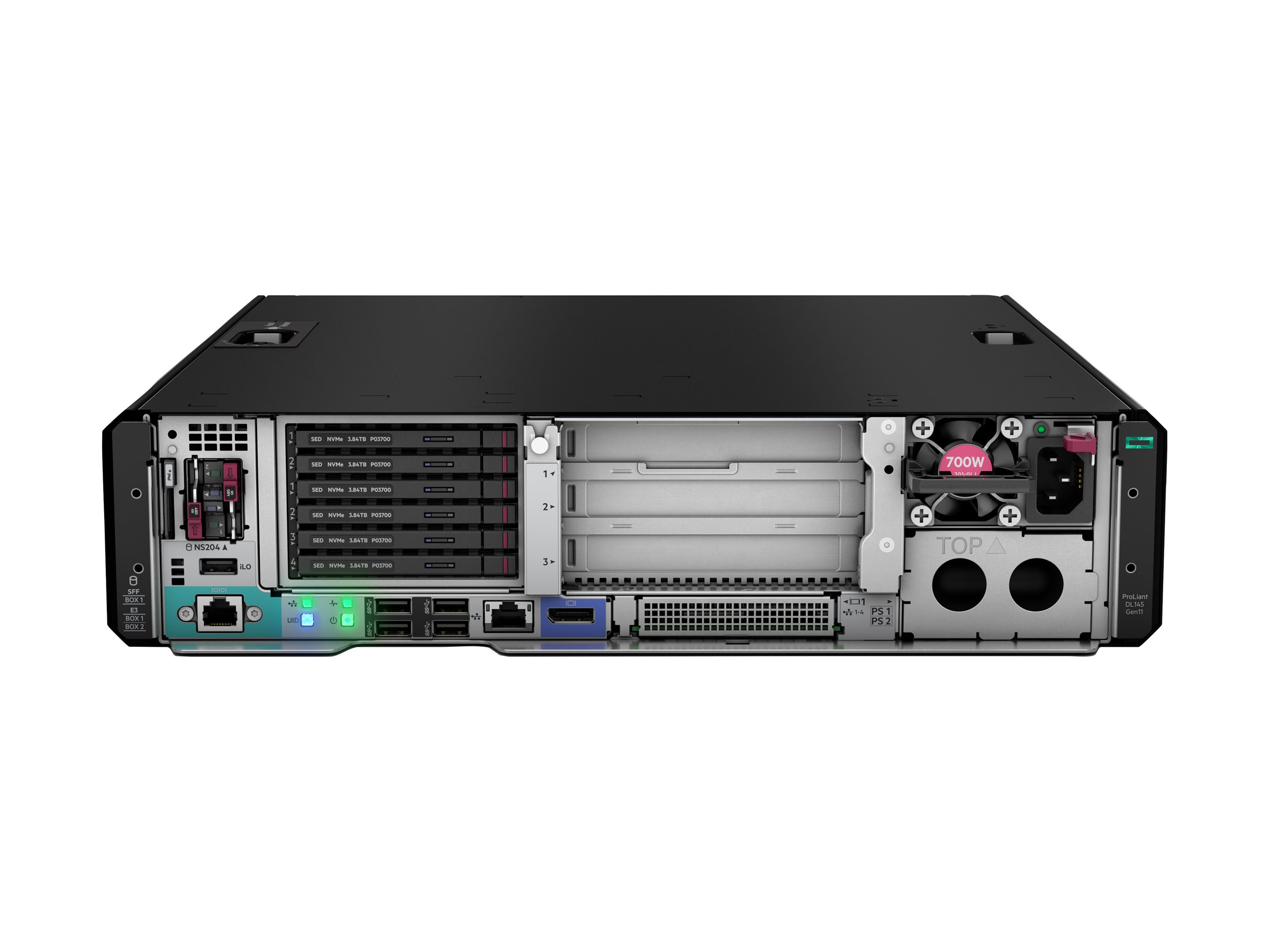 | Interface | 1 x HPE iLO (1 front) (serviceport) | 1 x HPE iLO - RJ-45 (1 front) (administrationsport) | 4 x USB 3.2 Gen 1 (4 front) | 1 x DisplayPort | 4 x LAN (Gigabit Ethernet) |