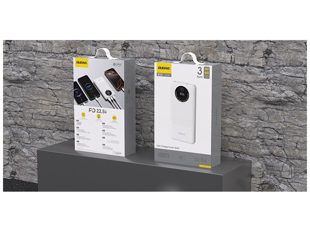 Dudao K12 - Powerbank - 10000 mAh - 22.5 Watt - 4.5A - 3 output-stikforbindelser (USB-A x2, USB-C x1 ) - Hvid