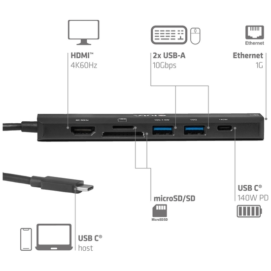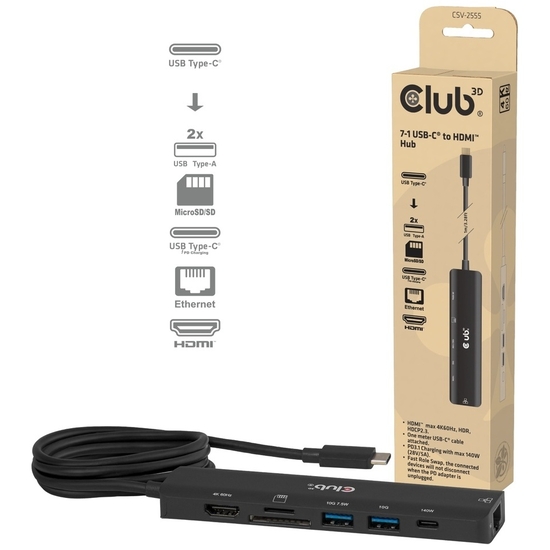 Club 3D CSV-2555 - Hub - USB Type-C - 2 x USB 3.2 Gen2 + 1 x 10/100/1000 + HDMI 2.0 + USB-C Power - MicroSD/SD kortlæser - desktop