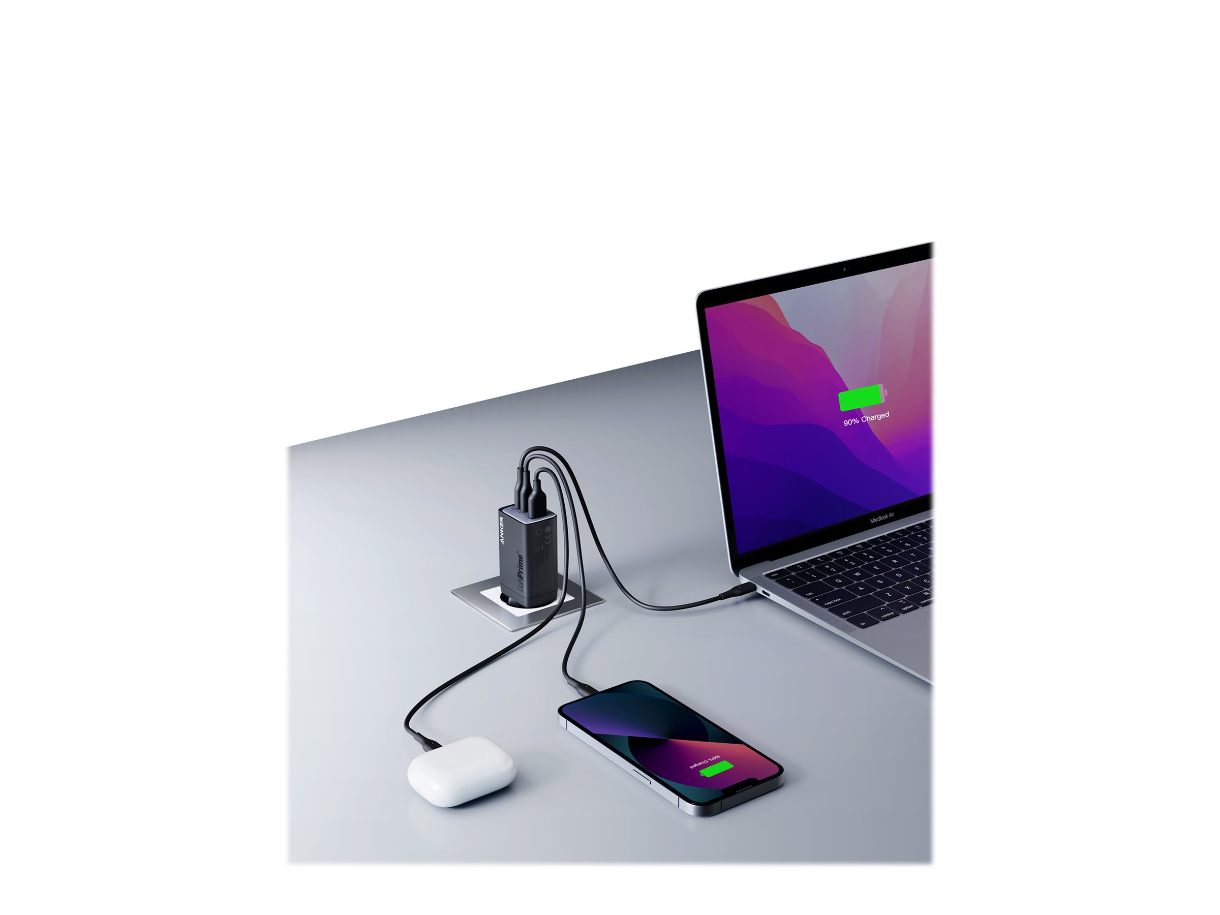 | Egenskaber | Kompakt design, oplader samtidigt op til 3 enheder, dynamisk strømkontrol, GaN Technology, ActiveShield 2.0, sammenlåst struktur |