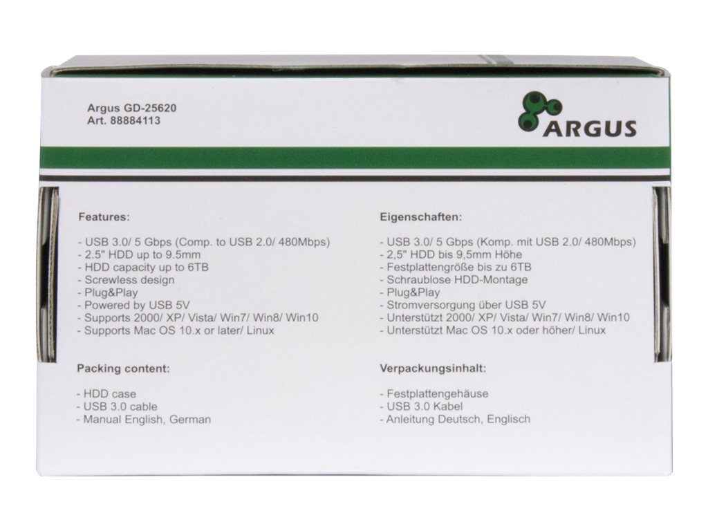 | Produktbeskrivelse | Argus HD-25620 - lagringspakning - SATA 6Gb/s - USB 3.0 |
