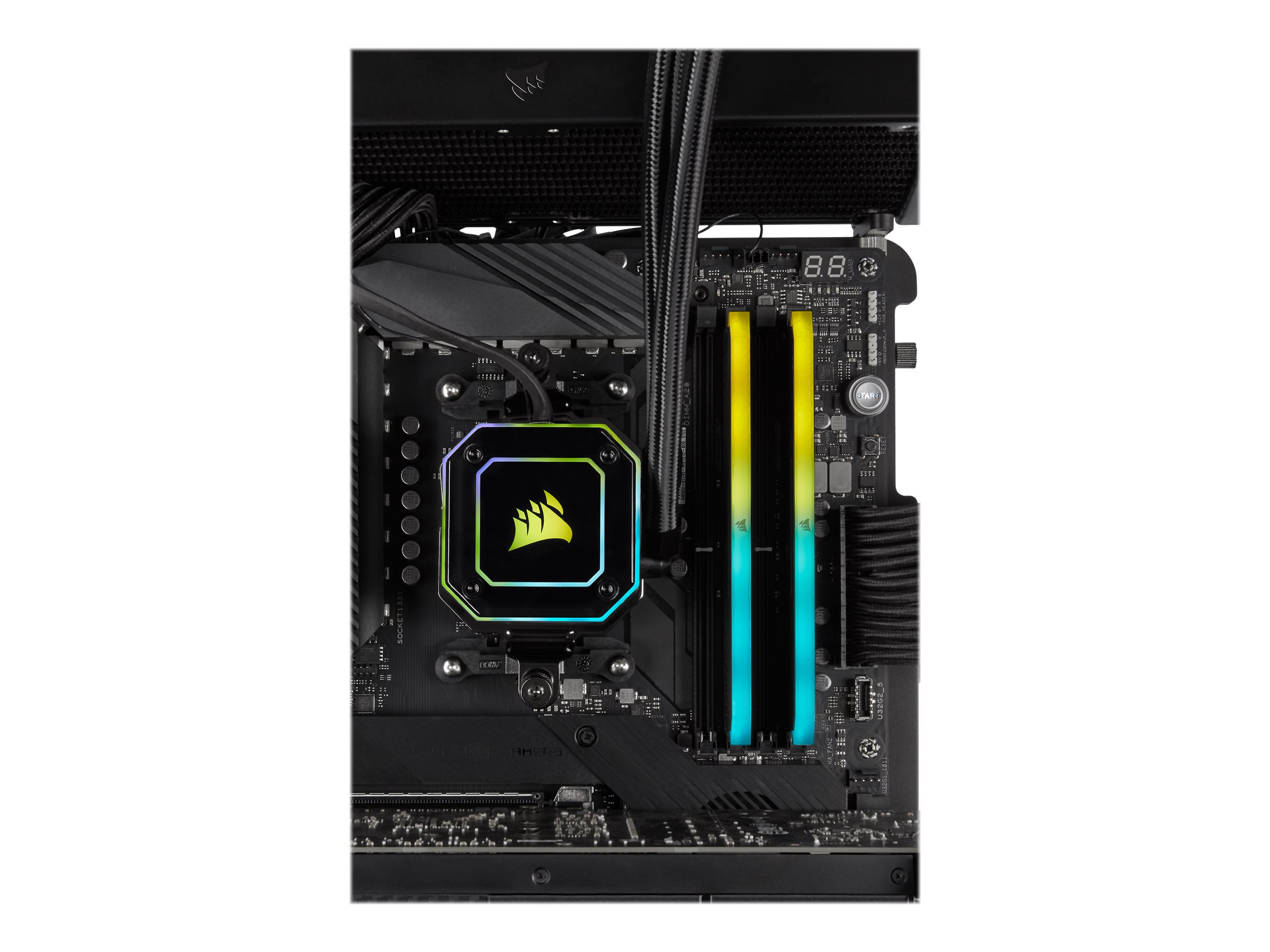 | Egenskaber | Anodized aluminum heatspreader, Intel Extreme Memory Profiles (XMP 2.0), dynamiske RGB-effekter, Corsair iCUE support, AMD Ryzen Ready, 6 adresserbare LED'er, ikke bufferet |