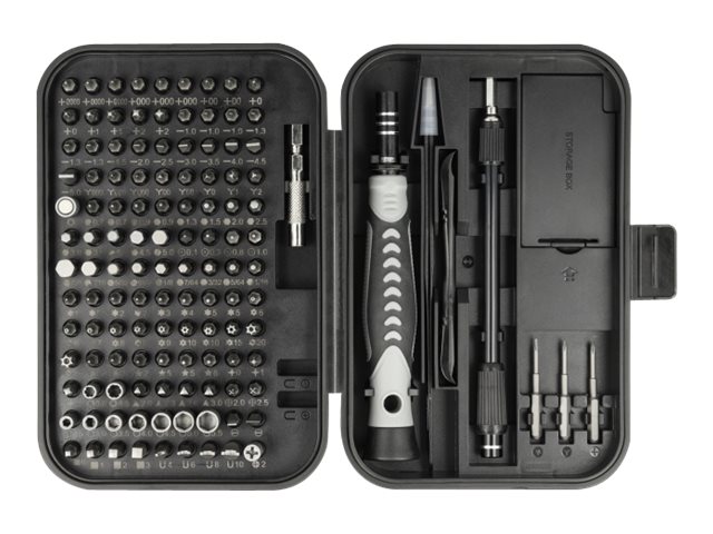 | Pakkeindhold | Sugekop, fleksibelt forlængerskaft, præcisionsskruetrækkerhåndtag, skraber, pincet, stemmejern, plastikstemmeværktøj, 3 åbningshakker, bitadaptersokkel 1/4" til 5/32" (magnetisk), 22 skruetrækker-præcisionsbits - hex H0.7 (x2), H0.9 (x2), H1.3, H1.5, H2.0, H2.5, H3.0, H3.5, H4.0, H4.5, H5.0, H6.0, H1/16, H5/64, H3/32, H7/64, H1/8, H9/64, H5/32, H3/16, 9 skruetrækker-præcisionssokkelbits - M2.5, M3, M3.5, M4.0, M4.5, M5.0, M5.5, G3.8, G4.5, 8 skruetrækker-præcisionsbits - torx T1, T2 (x3), T3, T4, T5 (x2), 11 skruetrækker-præcisionsbits - vandalsikre torx T6H (x2), T7H, T8H (x2), T9H, T10H (x2), T15H, T20H, T25H, 14 skruetrækker-præcisionsbits - sprække 1,0 (x3), 1,3 (x3), 1,5, 2,0, 2,5, 3,0, 3,5, 4,0, 4,5, 5,0 mm, 14 skruetrækker-præcisionsbits - phillips PH0000 (x3), PH000 (x3), PH00 (x2), PH0 (x2), PH1 (x2), PH2 (x2), 3 skruetrækker-præcisionsbits - pozidriv PZ0, PZ1, PZ2, 8 skruetrækker-præcisionsbits - tri-wing Y000 (x3), Y00 (x2), Y0, Y1, Y2, 6 skruetrækker-præcisionsbits - pentalobe P2 (x3), P5 (x2), P6, 4 skruetrækker-præcisionsbits - triangel TA2.0, TA2.3, TA2.6, TA3.0, 4 skruetrækker-præcisionsbits - kvadrat SQ0, SQ1, SQ2, SQ3, 4 skruetrækker-præcisionsbits - U-form U4, U6, U8, U10, 4 skruetrækker-præcisionsbits - SIM 0,1, 0,3, 0,8, 1,0, skruetrækker-præcisionsbit - phillips PH2 (isoleret), skruetrækker-præcisionsbit - phillips PH000 - lang, skruetrækker-præcisionsbit - tri-wing Y000 - lang, skruetrækker-præcisionsbit - pentalobe P2 - lang |
