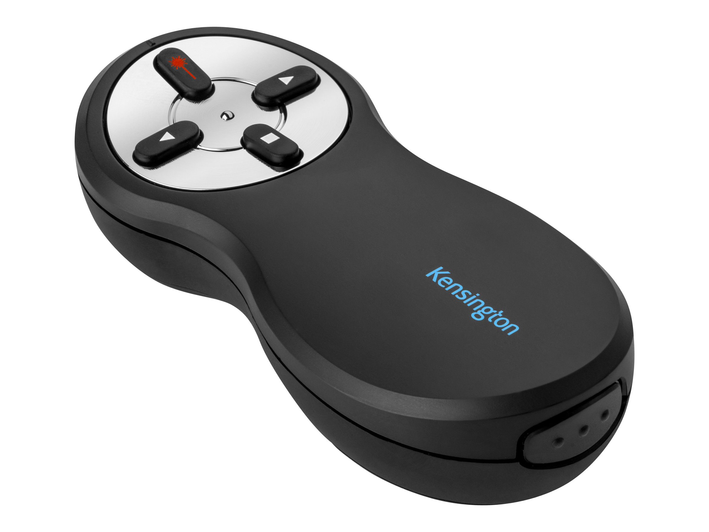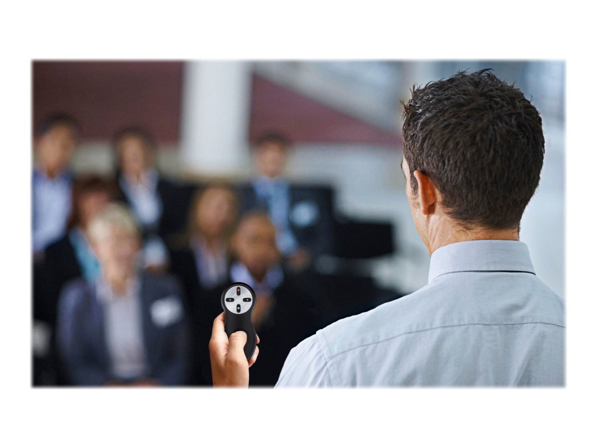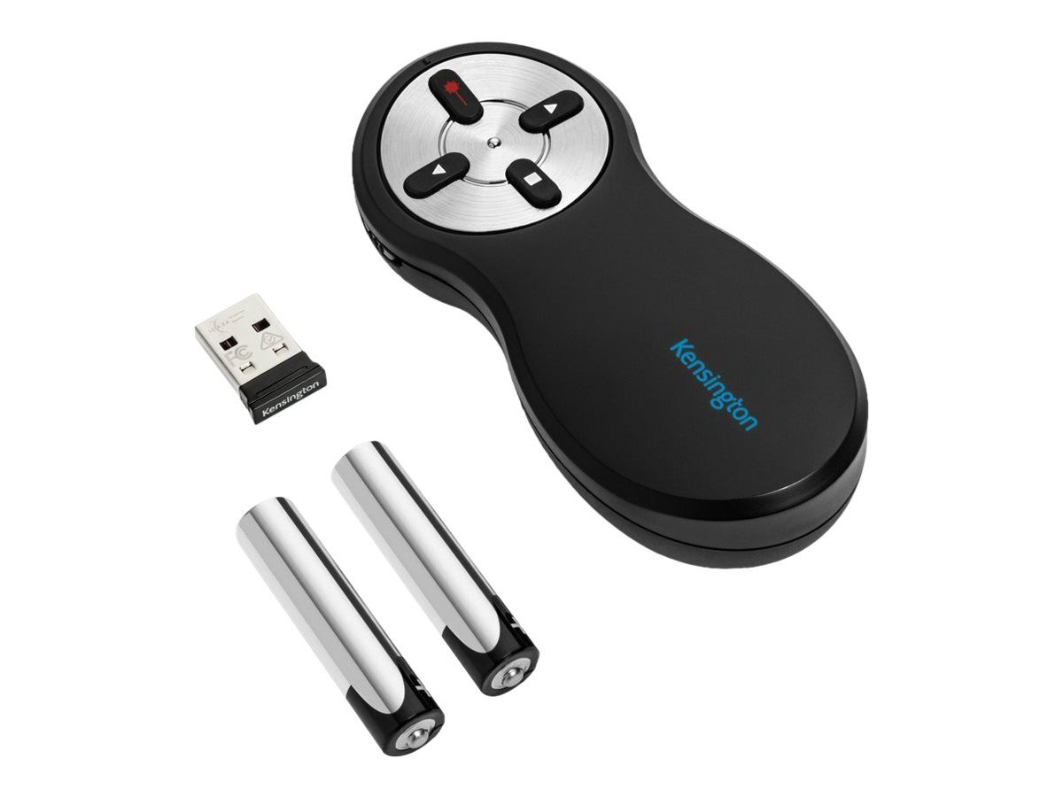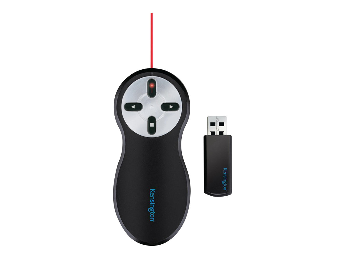 Kensington Wireless Presenter med rød laser giver dig kontrol over din præsentation og dit publikum. Produktet er nemt at transportere, brugervenligt og lader dig fokusere på det vigtigste – nemlig din præsentation. Enkle frem- og tilbageknapper er suppleret med en smart knap til at fjerne indholdet på skærmen, så du kan skjule dine dias, mens du arrangerer dem, eller fjerne opmærksomheden fra skærmen og hen på dig selv. Trådløs 2,4 GHz Plug & Play-teknologi betyder, at du ikke behøver bekymre dig om interferens fra andre enheder eller unødvendige ledninger. Det stærke røde laserlys gør det nemmere at belyse dine centrale budskaber. Fjernbetjeningen til præsentationsenheden er ergonomisk udformet, så den ligger behageligt i hånden.