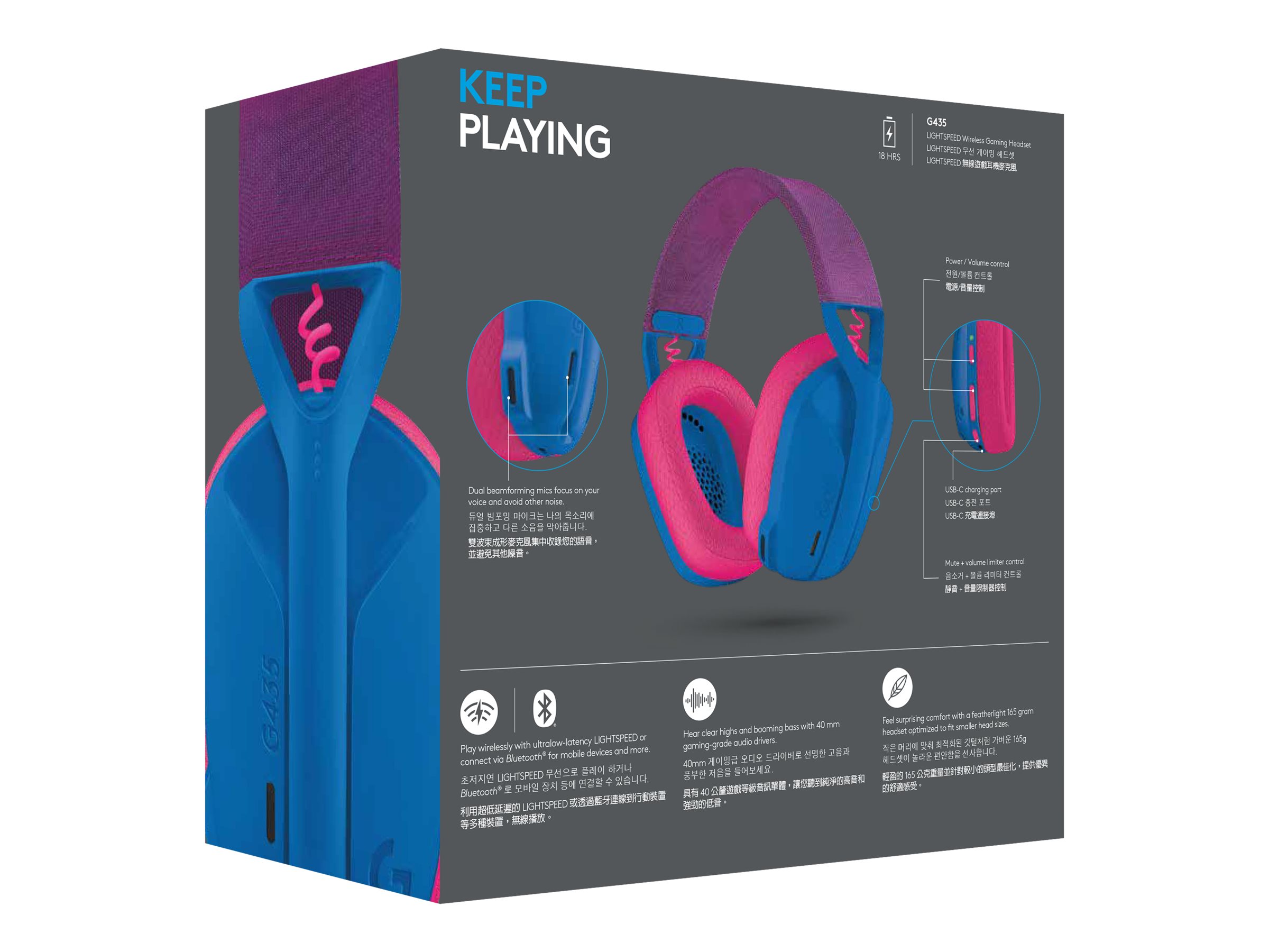 Spil spil og musik med fjerlet komfort og kraftfuld og ren lyd. Dobbelte mikrofoner med stråleformning reducerer baggrundsstøj Du kan oprette forbindelse til dine enheder via trådløs LIGHTSPEED i spilkvalitet og Bluetooth .