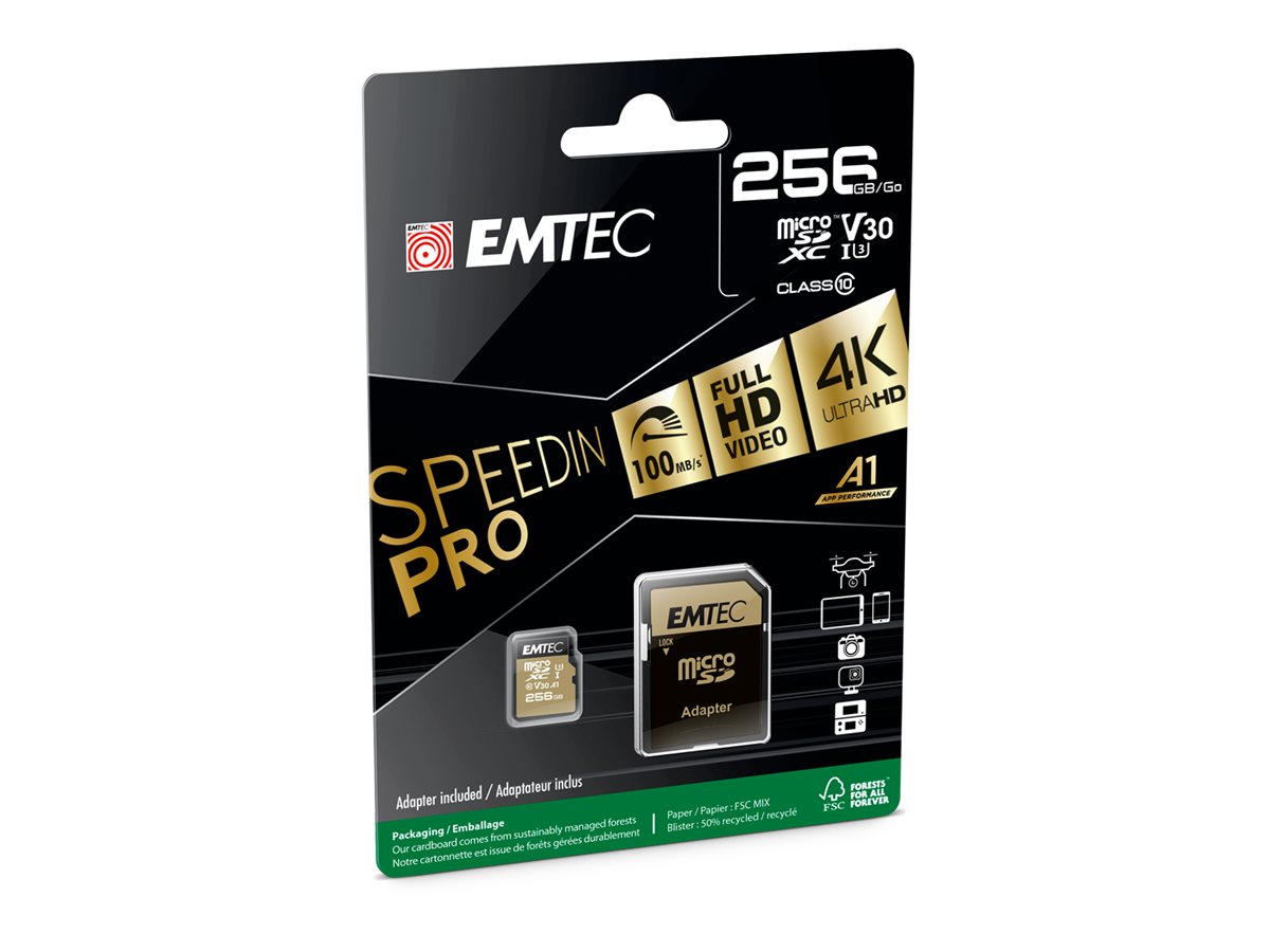 | Produktbeskrivelse | EMTEC SpeedIN' PRO - flashhukommelseskort - 256 GB - microSDXC UHS-I |