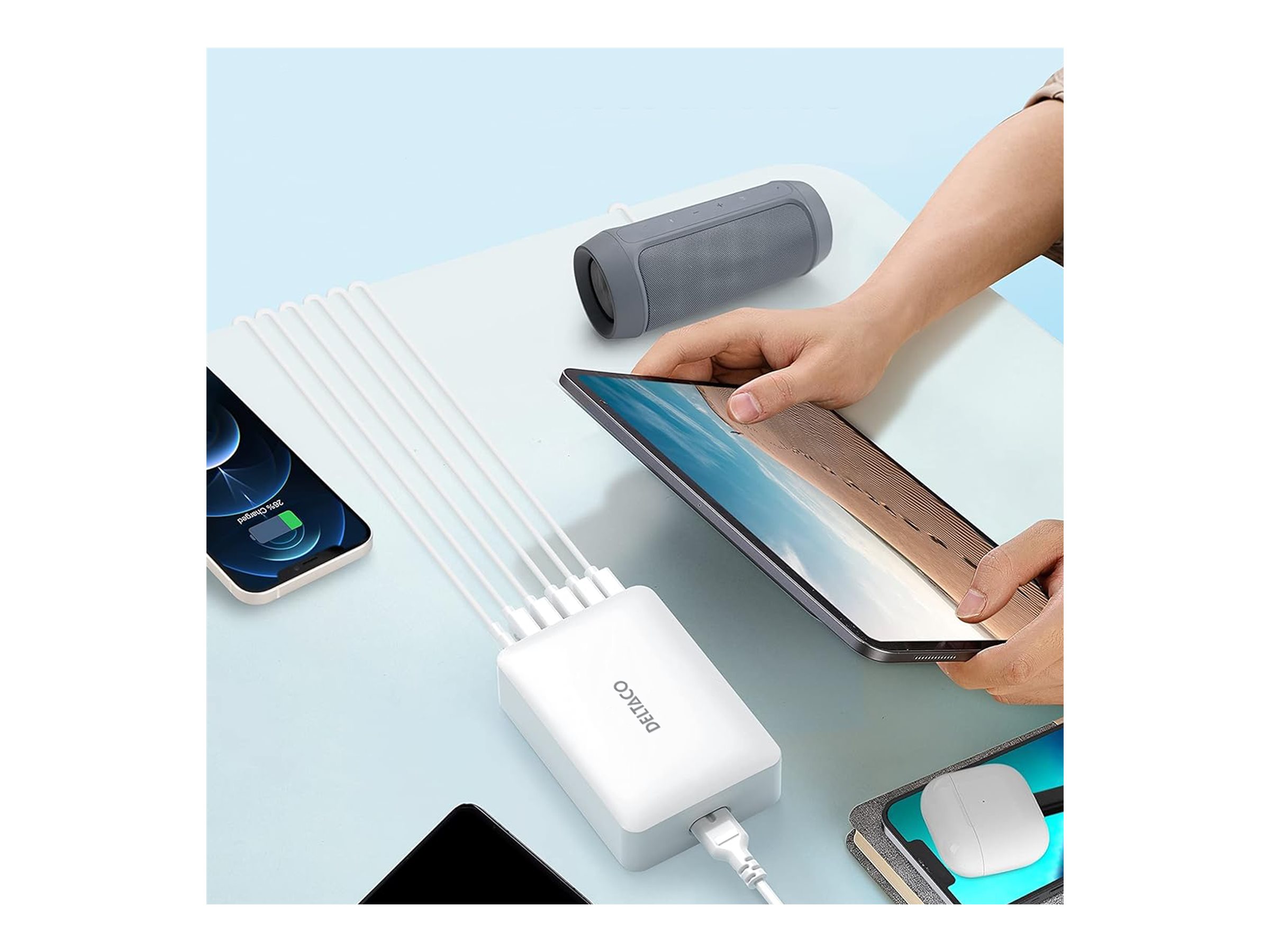 Denne ladestation har i alt seks udgangsstik, herunder en 24-pin USB-C og fem 4-pin USB Type-A-porte, så brugerne kan oplade flere enheder samtidigt.