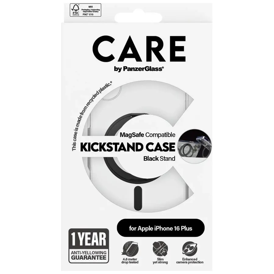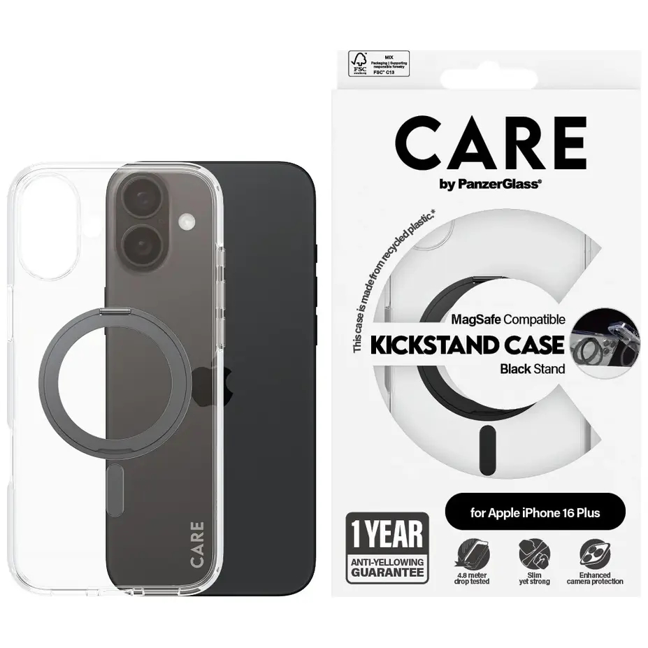 PanzerGlass CARE Feature Case Kickstand - Bagsidecover til mobiltelefon - med støtteben - MagSafe-kompatibilitet - Gennemsigtig / Sort - for Apple iPhone 16 Plus