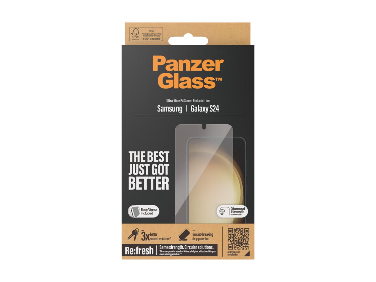 60 % genanvendt glas. 100 % styrke. 100 % original. Med den her skærmbeskytter fra PanzerGlass får du det hele. Det hærdede glas fungerer som en diskret airbag, der holder både ridser, revner, slag og stød på sikker afstand, så du kan gå gennem livet med ro i maven og en skærm, der bliver ved med at se ud som ny. Skærmbeskytteren er lavet af næsten to tredjedele genanvendt glas og har endda en smudsafvisende belægning, der reducerer fedtfingre og snavs. Den medfølgende EasyAligner lavet af 100 % genanvendt plast gør installationen så legende let, at de fleste kan klare den i første forsøg. Og ellers følger du bare trin-for-trin-guiden eller scanner QR-koden til sådan-installerer-du-videoen. Når først skærmbeskyttelsen sidder på telefonen, er det slut med at frygte synet af din skærm med kurs mod asfalten. Det kommer muligvis aldrig til at ske, men hvis det gør, vil du fortryde, at du ikke klikkede "Tilføj til kurv". Skærmbeskytteren kan forlænge levetiden på din telefon, så du en dag kan give den videre til en anden, som vil elske den lige så højt som dig. Det er ren telefonkærlighed – og én måde at bidrage til en mere bæredygtig fremtid på! En anden er at bruge mindre emballage: I 2024 reducerede vi mængden af papir i vores emballager med 66 %*, og vi leverer selvfølgelig dette produkt i en genanvendelig FSC -mærket æske. Skærmbeskytteren har størrelsen "Ultra-Wide Fit". Det betyder, at den dækker fronten af din telefon, samtidig med at den giver dig en fuldendt skærmoplevelse og efterlader lidt plads langs kanterne til et beskyttende cover fra PanzerGlass . Det kunne fx være et designercover fra CARE by PanzerGlass . Og vil du passe ekstra godt på din telefon, kan du nemt kombinere skærmbeskytteren og coveret med en PanzerGlass PicturePerfect eller Hoops kameralinsebeskytter. *Gennemsnitlig reduktion fra 2022 til 2024 beregnet ved at sammenligne udvalgte PanzerGlass kerneprodukter.