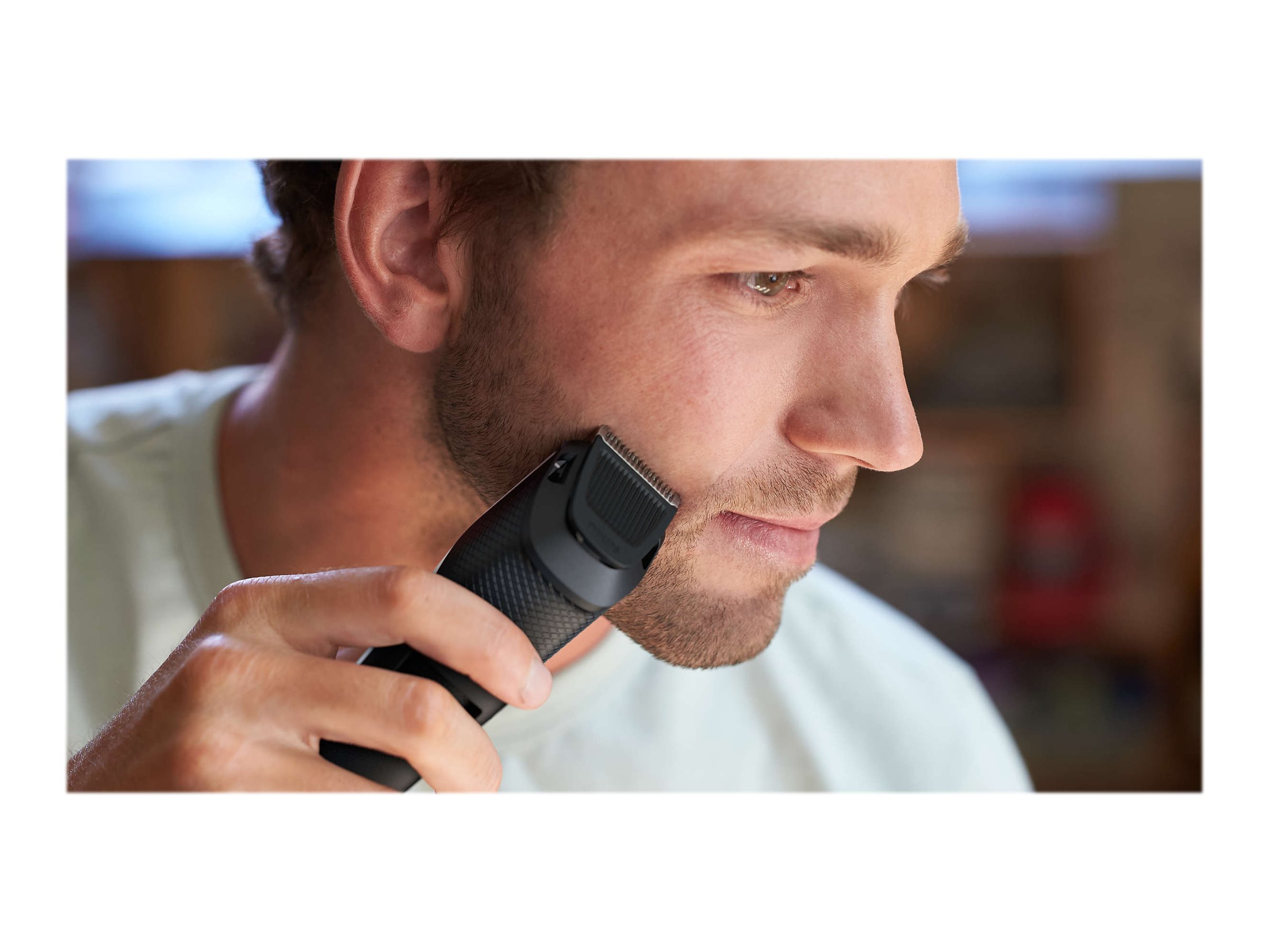 Denne trimmer med det innovative Lift & Trim-system løfter og opfanger mere lavtliggende hår, så du får en effektiv og ensartet trimning. På denne måde får du nemt det udseende med tredagesskægstubbe, kort eller langt skæg, du ønsker.