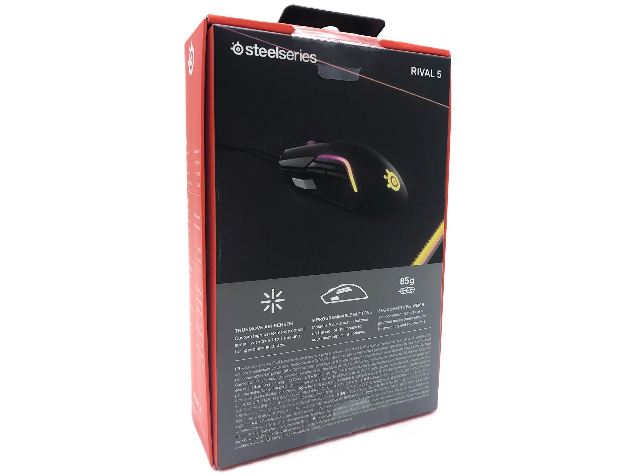 | Egenskaber | Polytetrafluoroethylene (PTFE) feet, 9 programbare knapper, RGB 16,8 millioner flerfarvet belysning, sand 1:1 sporing, håndfladegrip, klogrip, Golden Micro IP54 mekaniske kontakter, SteelSeries TrueMove Air sensor, 80 millioner klik, 10 RGB-zoner |