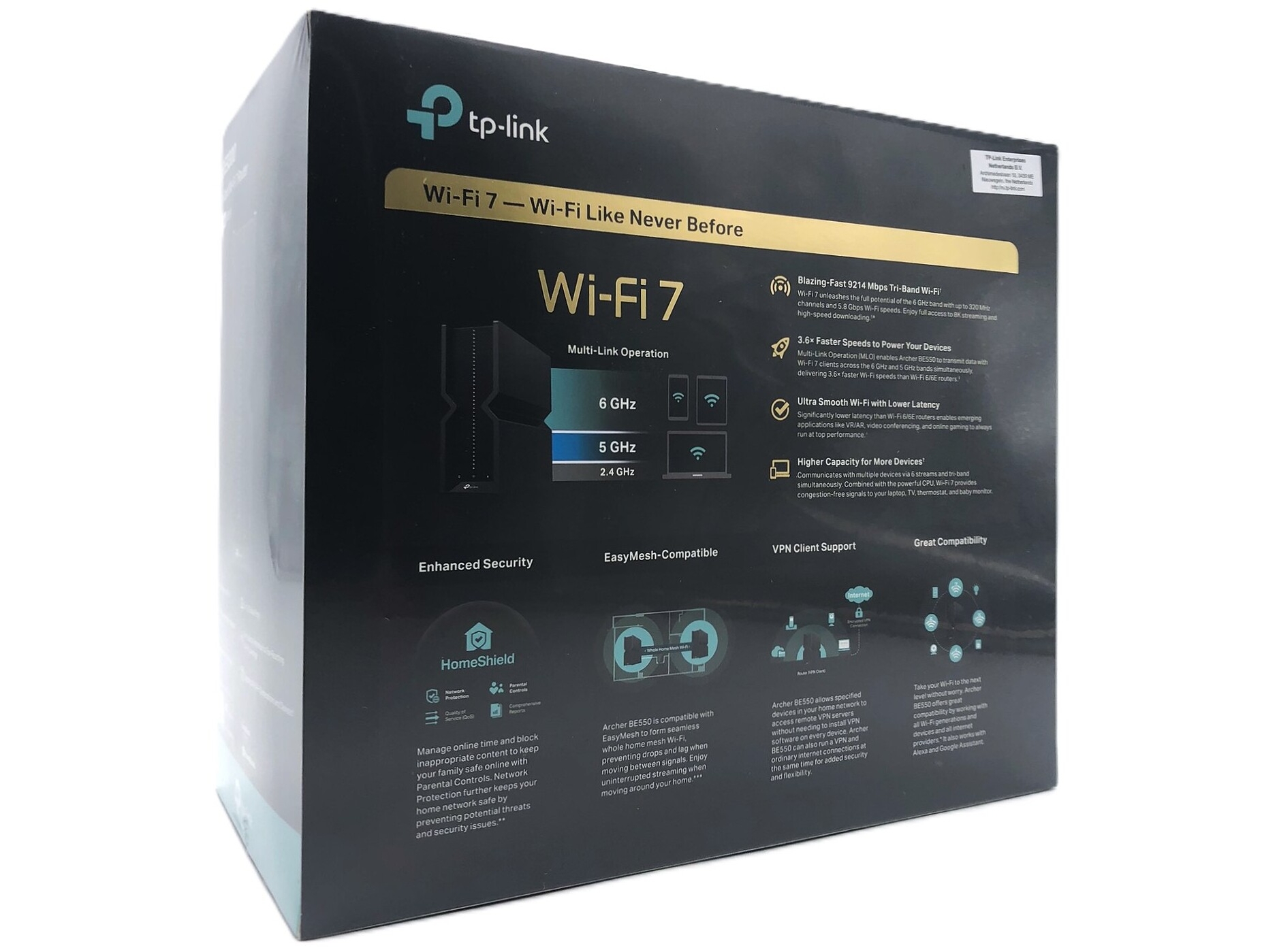 Archer BE550 V1 leverer høje dataoverførselshastigheder på op til 9214 Mbps, understøttet af Wi-Fi 6E-teknologi og flere båndbreddeindstillinger, hvilket sikrer jævn 4K/8K UHD-videostreaming og effektiv tilslutning af flere enheder.