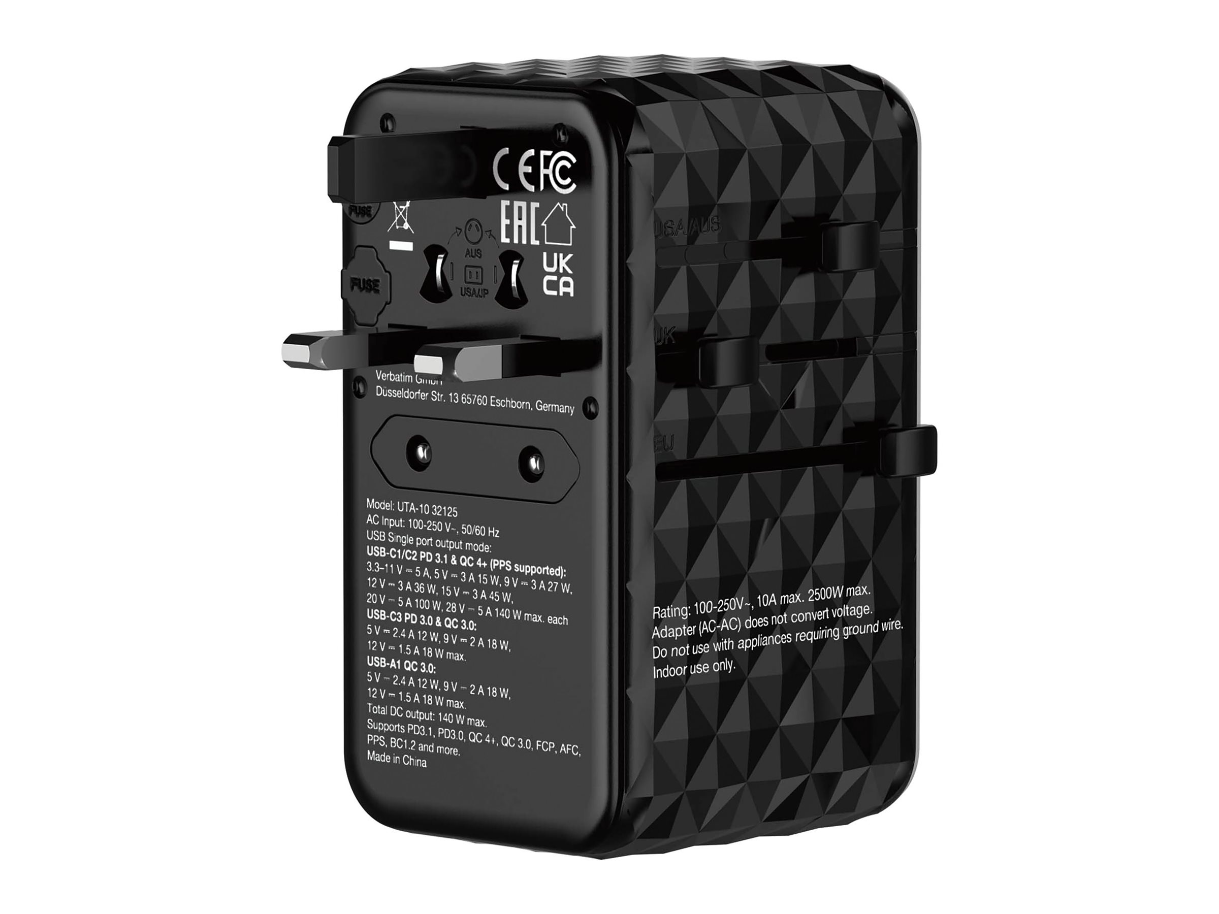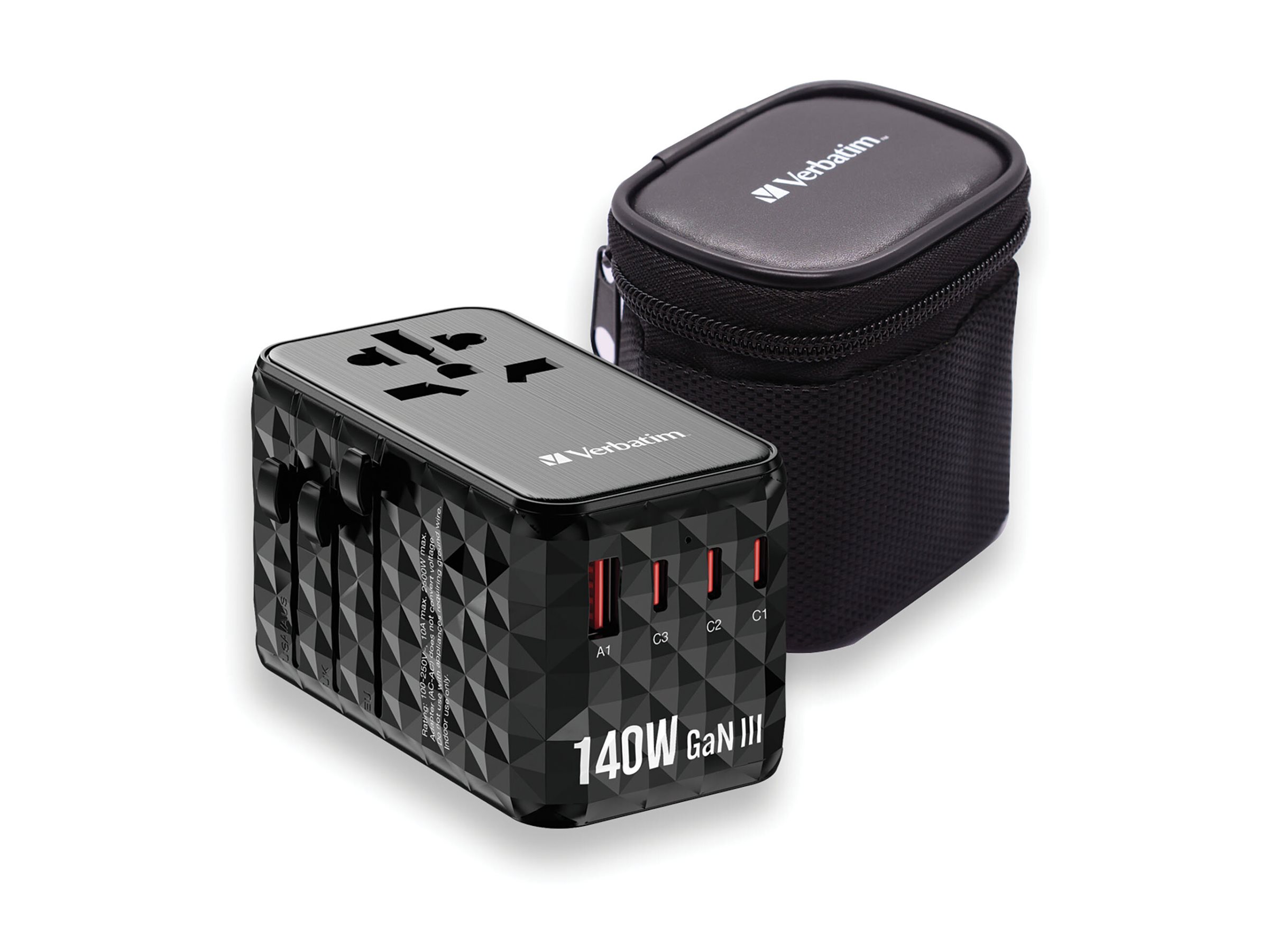 | Produktbeskrivelse | Verbatim UTA-10 strømforsyningsadapter - GaN III, universel - 3 x USB-C, USB - 140 Watt |