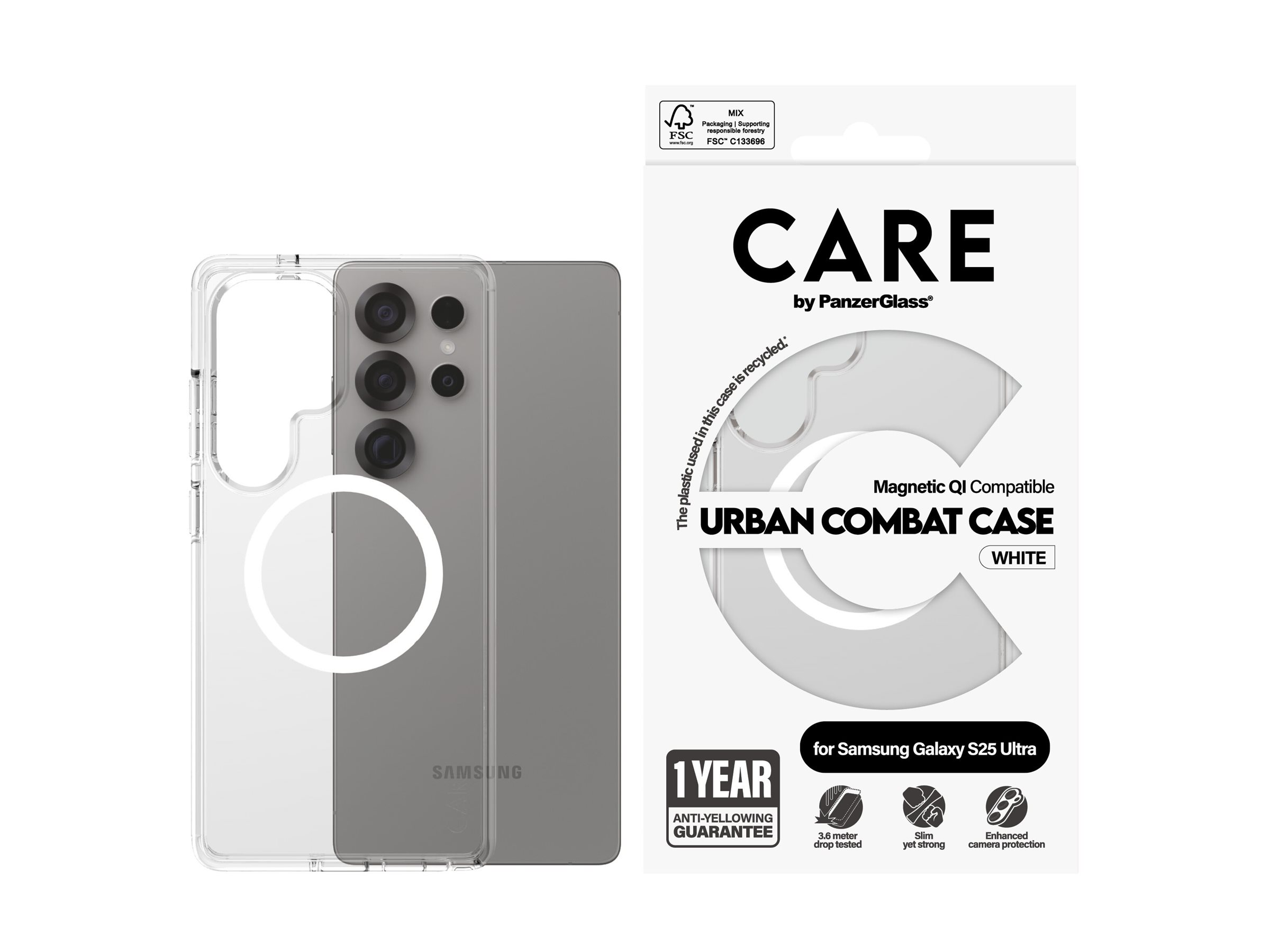 PanzerGlass CARE by Flagship Case Transparent Urban Combat w. White Qi Compatible Samsung Galaxy S25 Ultra Beskyttelsescover Transparent Samsung Galaxy S25 Ultra