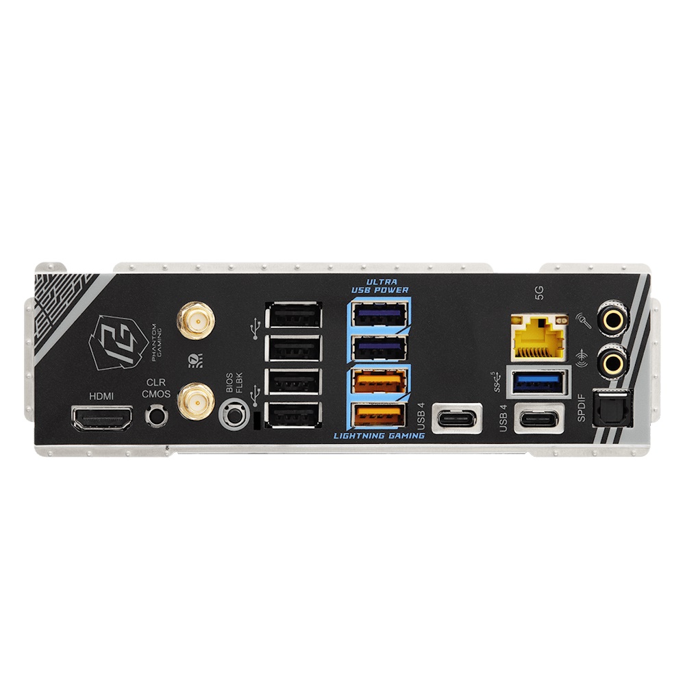 | Rear Panel I/O | 2x Antenna Ports, 1x HDMI Port, 1x Optical SPDIF Out Port, 3x USB4 Type-C Ports (40 Gb/s), 2x USB 3.2 Gen2 Type-A Ports (10 Gb/s), 3x USB 3.2 Gen1 Type-A Ports, 4x USB 2.0 Ports, 1x RJ-45 LAN Port, 1x Line Out Jack (Gold Audio Jack), 1x Microphone Input Jack (Gold Audio Jack) |