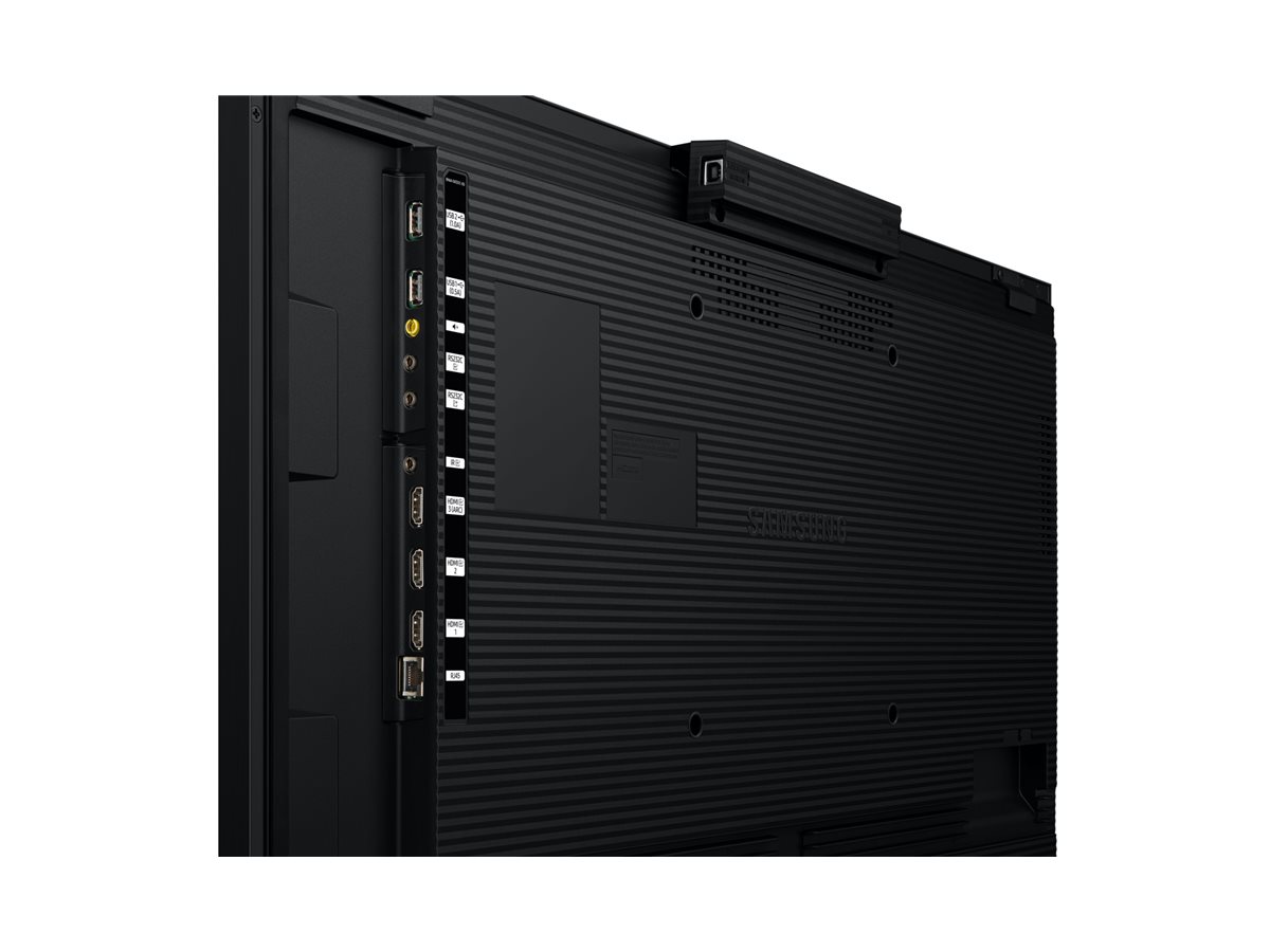 Skærmen har en række tilslutningsmuligheder, såsom USB, HDMI, audio line-out, LAN og RS-232C-indgange, hvilket sikrer kompatibilitet med forskellige enheder.