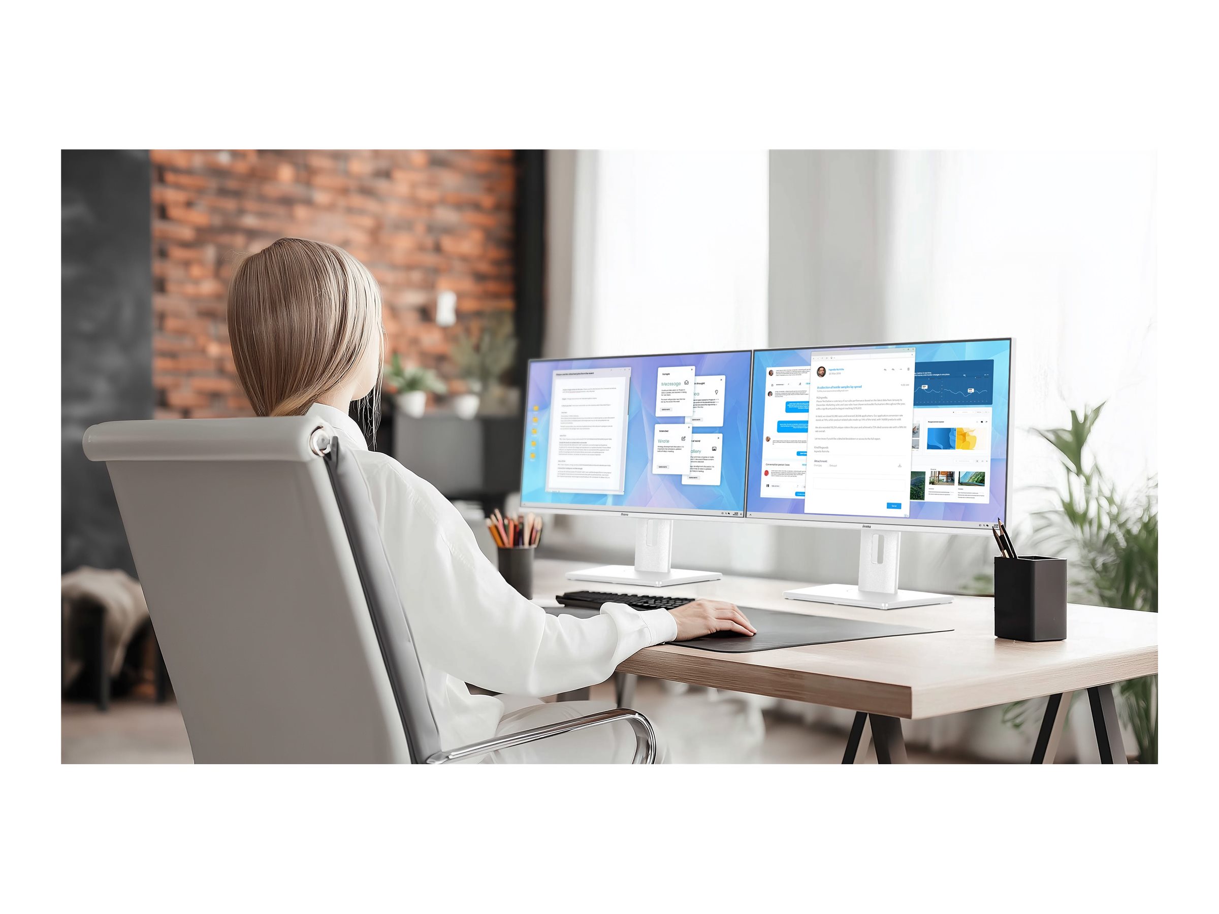 Skærmens stativ kan justeres i højden med 150 mm og kan drejes, vippes og hældes, så brugerne kan skabe de mest behagelige betragtningsvinkler.