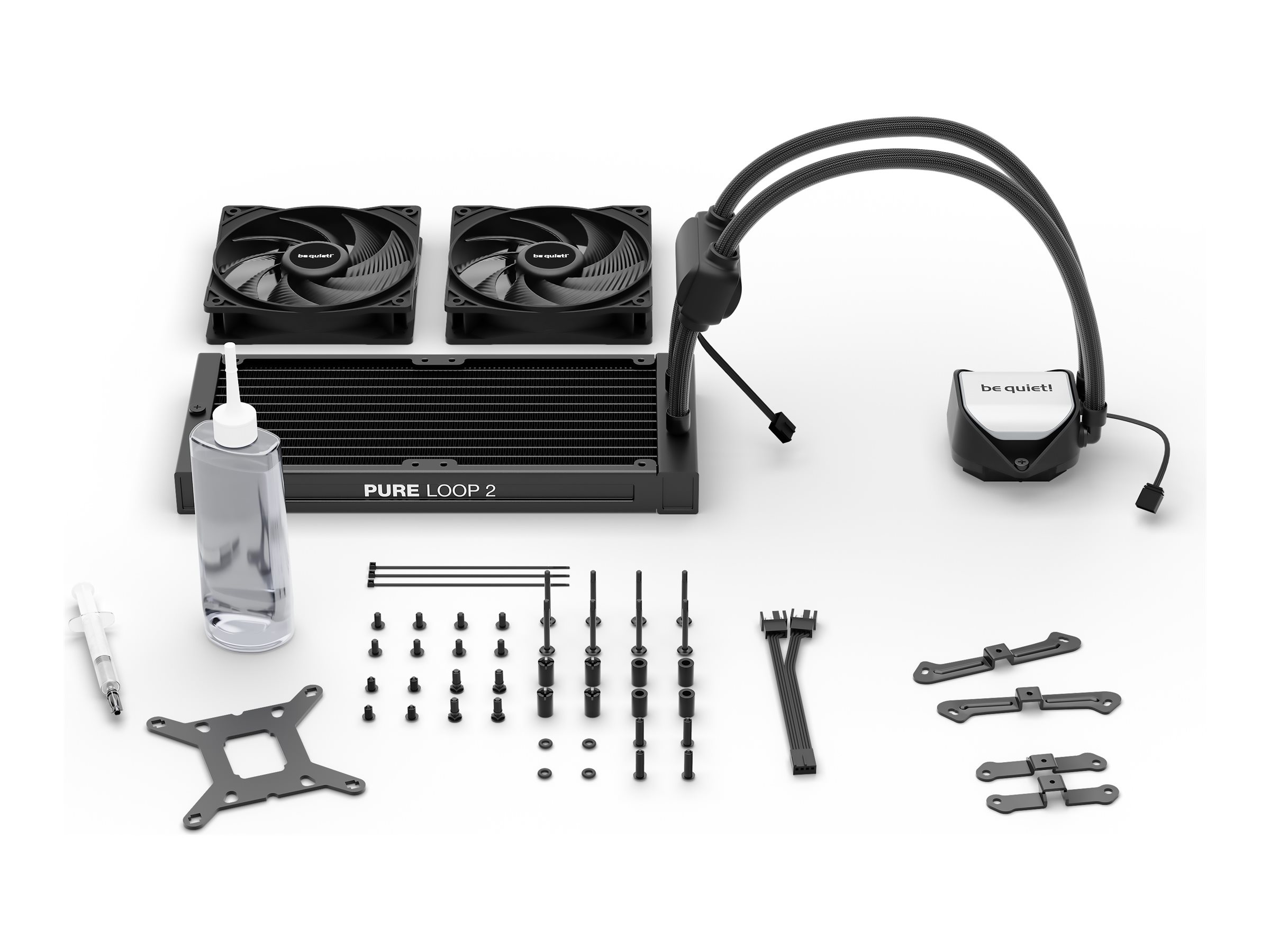 Be quiet! Pure Loop 2 er et væskekølesystem til processorer, der er designet til effektivitet og støjsvag drift. Det har en 240 mm radiator og to 120 mm blæsere for optimal varmeafledning, hvilket sikrer, at dit system forbliver køligt under store belastninger. Dette kølesystem understøtter en bred vifte af sokler, hvilket giver alsidighed til forskellige stationære computere og servere. Med støjniveauer mellem 15,4 og 34,9 dBA giver det et distraktionsfrit miljø. Pakken indeholder et Y-Split-kabel, kølevæske, monteringshardware og termisk fedt til nem installation. Det holdbare design med forniklet finish og sleevede rør gør be quiet! Pure Loop 2 til en pålidelig og visuelt tiltalende køleløsning.