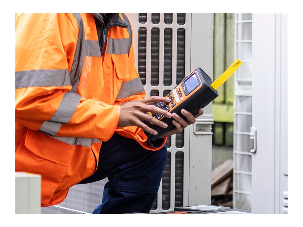 Denne labelmaskine er udstyret med et indbygget genopladeligt lithium-ion-batteri og inkluderer tilbehør som en bæretaske og en håndledsrem og er designet til brug på farten, så du kan printe labels, uanset hvor du er.