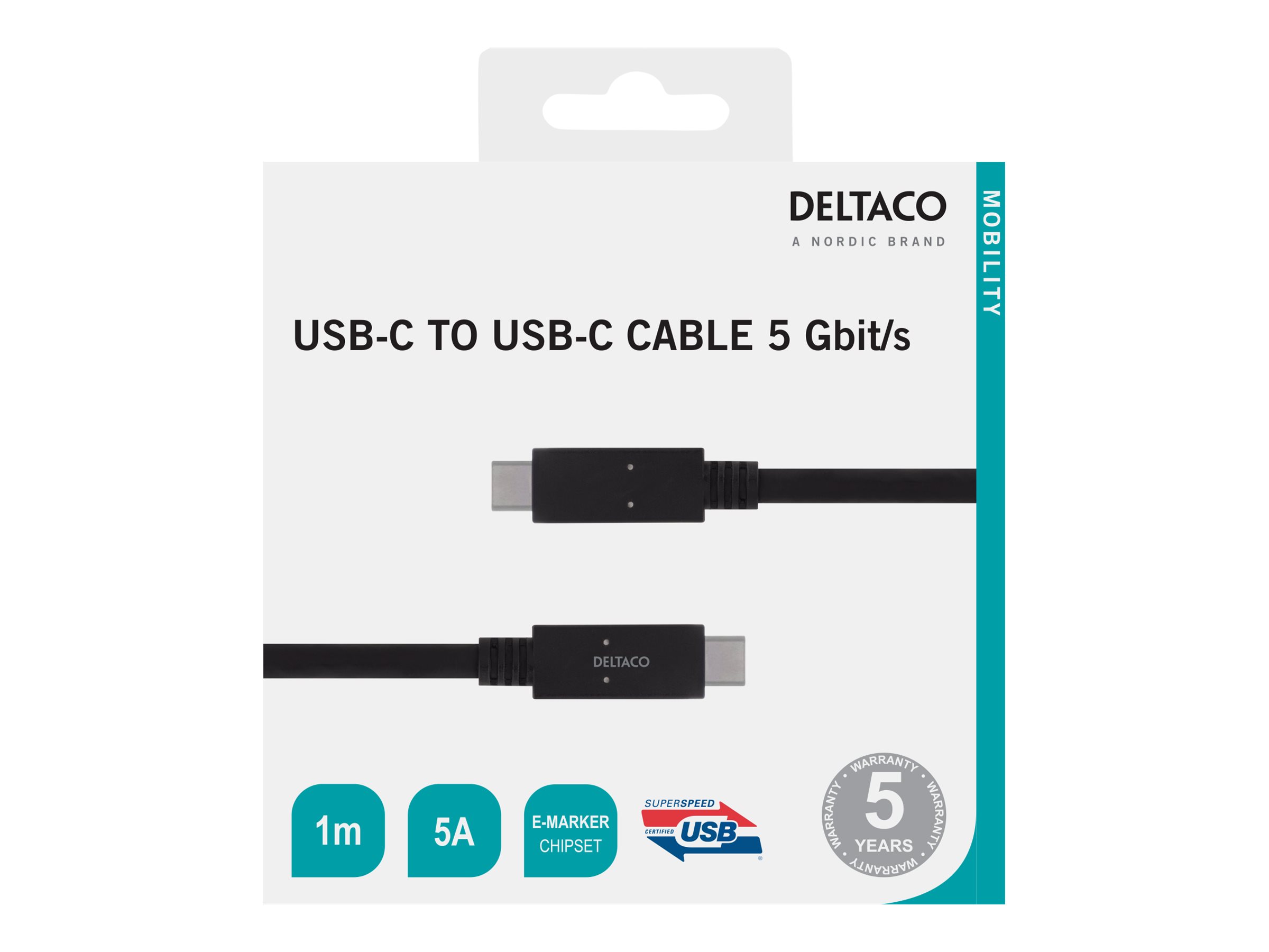 USB-C til USB-C tilslutningskabel med 5 Gbit/s overførselshastighed og op til 5 A udgangsstrøm.