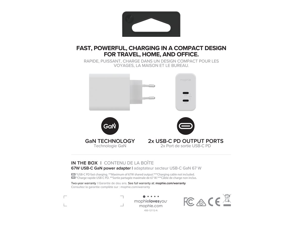 | Produktbeskrivelse | mophie speedport 67 strømforsyningsadapter - USB-C - 67 Watt |