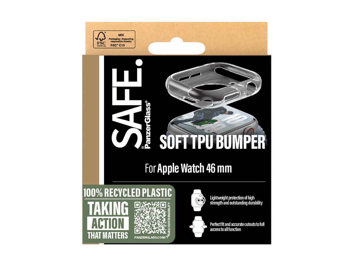 Uanset om du slår dit splinternye ur mod jorden under armbøjninger, eller ved et uheld støder det mod et skarpt hjørne af sofabordet, så har denne bumper fra SAFE. by PanzerGlass dig dækket ind. Denne gennemsigtige bumper uden glas fra SAFE. by PanzerGlass beskytter dit ur mod ridser og fald, samtidig med at den giver nem adgang til alle funktioner. Du behøver ikke engang tage den af, når du oplader dit ur! Det er maksimal stil og maksimal beskyttelse! Lavet af blødt, let TPU-materiale for en perfekt pasform. Keep your watch SAFE.